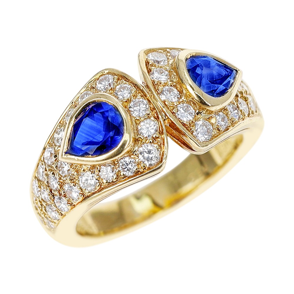 Featuring 2 pear-shaped sapphires, surrounded by round diamonds.