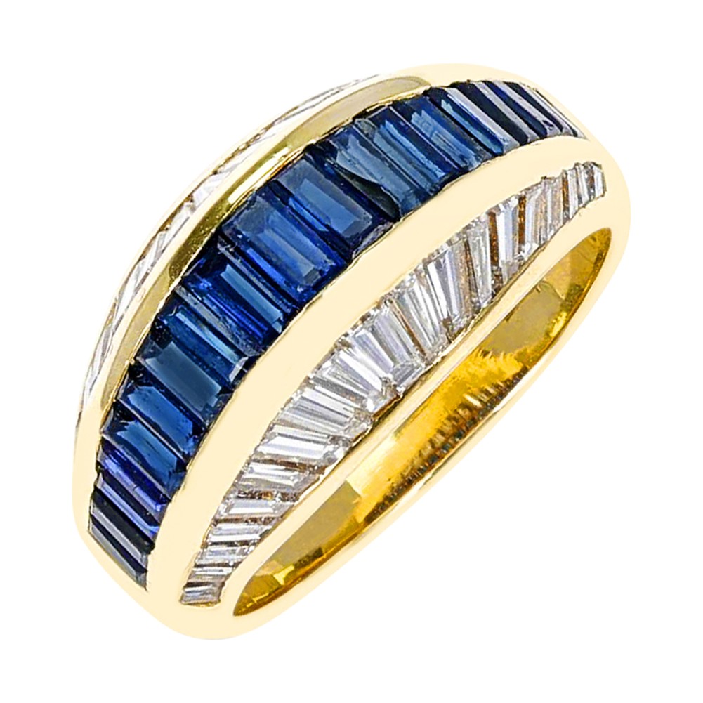 Featuring channel-set rectangular sapphires in the center, accented by tapered baguette diamonds.