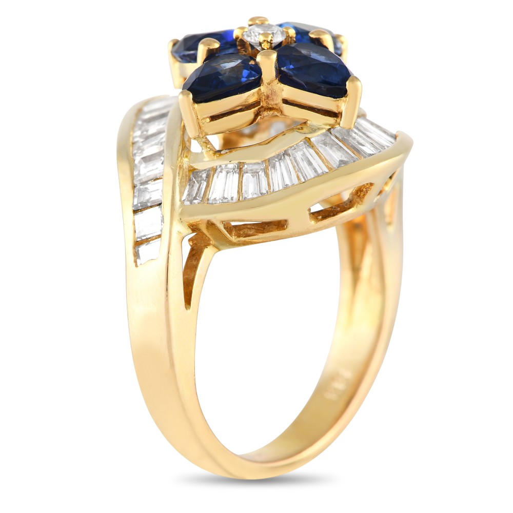 Centering a flower motif, composed of 4 pear-shaped sapphires and 1 round brilliant-cut diamond, accented by baguette-cut diamonds.