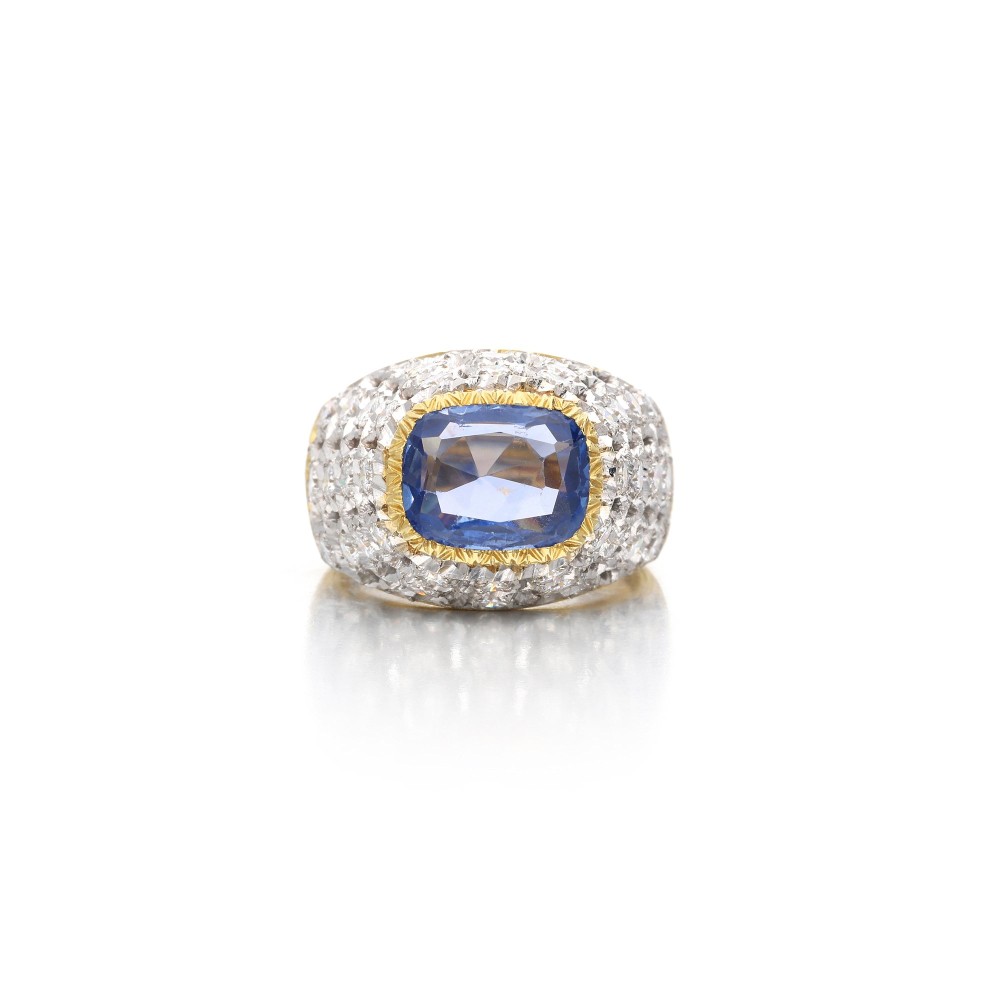 Centering a cushion-shaped sapphire, accented by round brilliant-cut diamonds.
