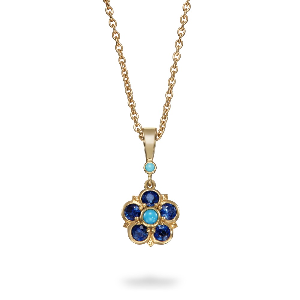 Designed with floral motifs inspired by Elizabethan England, the pendant features 5 sapphires, 2 turquoises and 1 rose-cut diamond on the back.