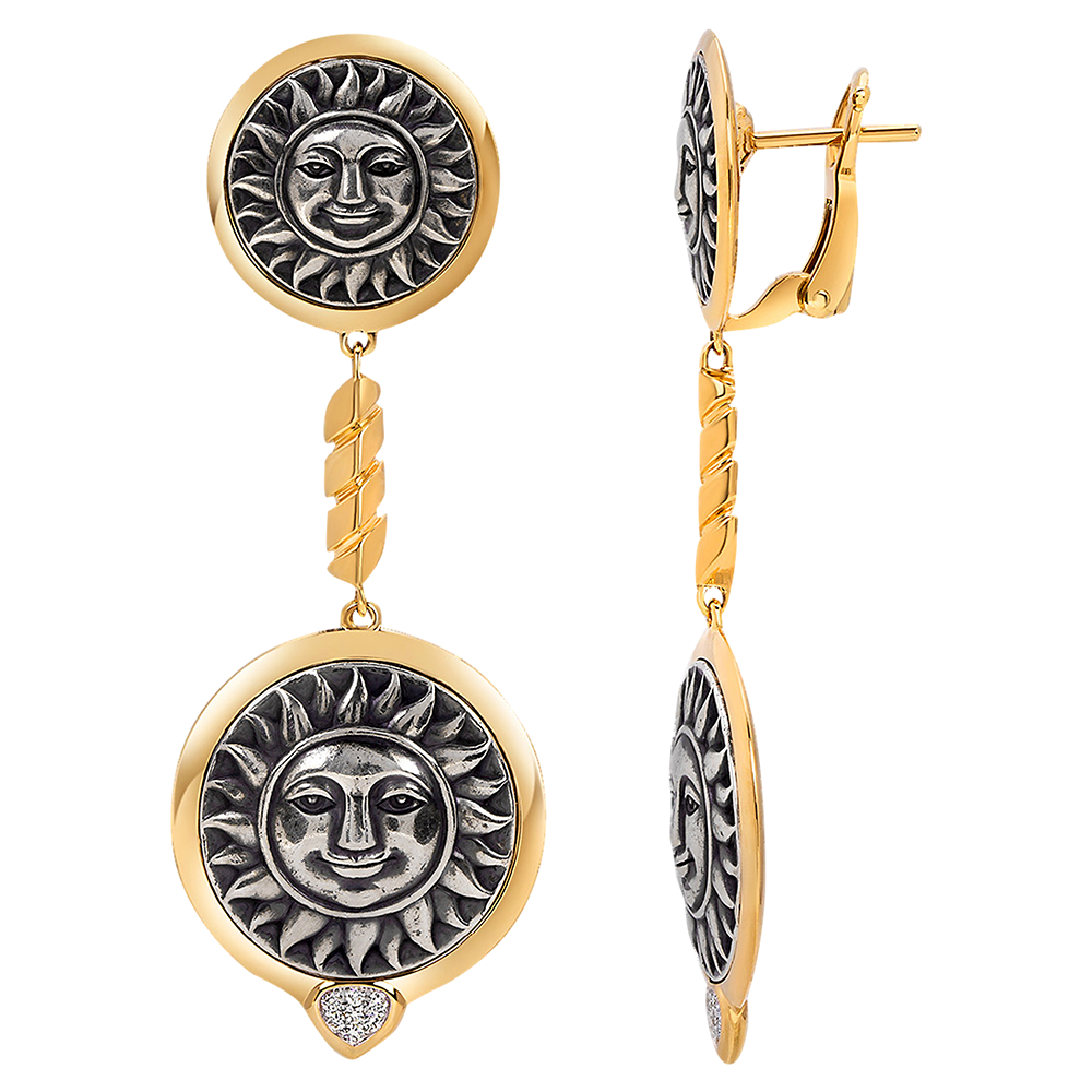 The earrings are designed as larger stylized silver sun coins, accented by pav? diamonds suspended from smaller stylized silver sun coins.