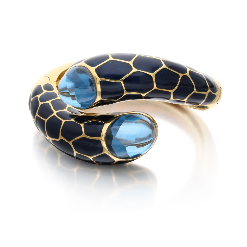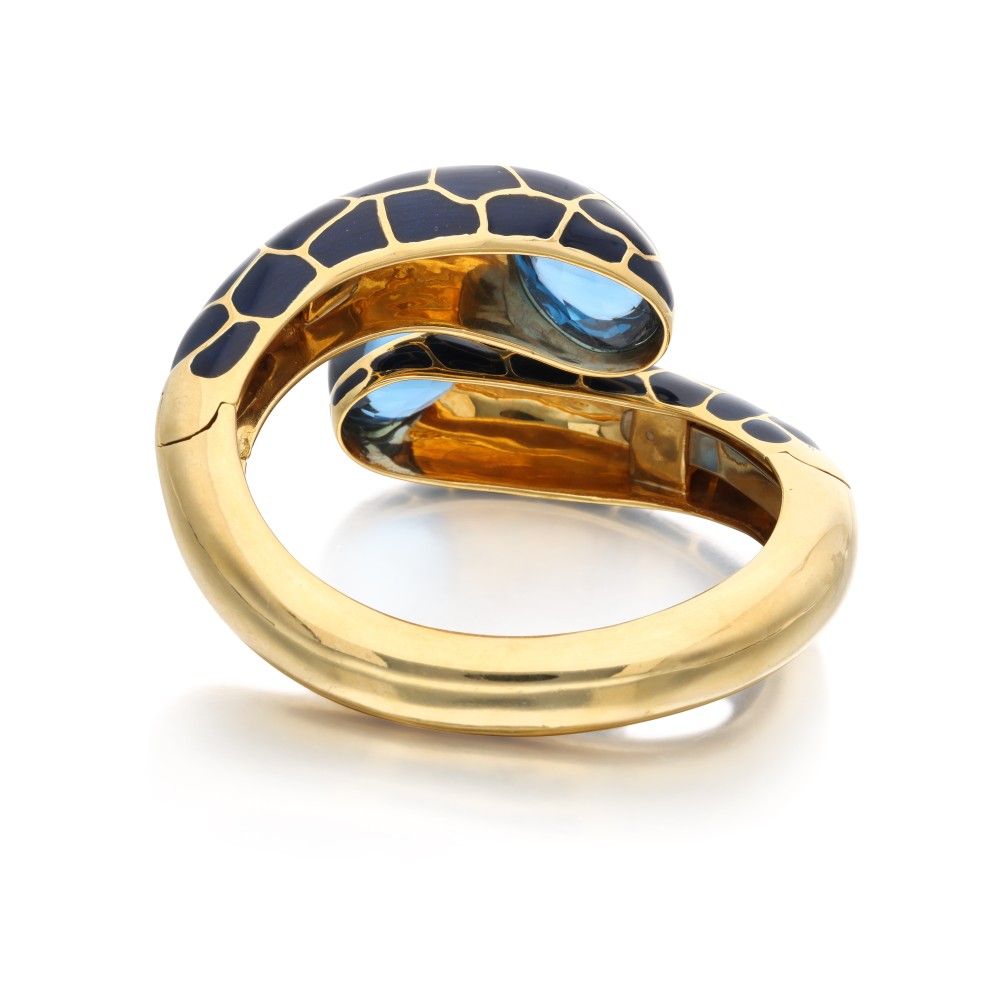 Of crossover design, composed of blue enamel, set with topaz cabochons.