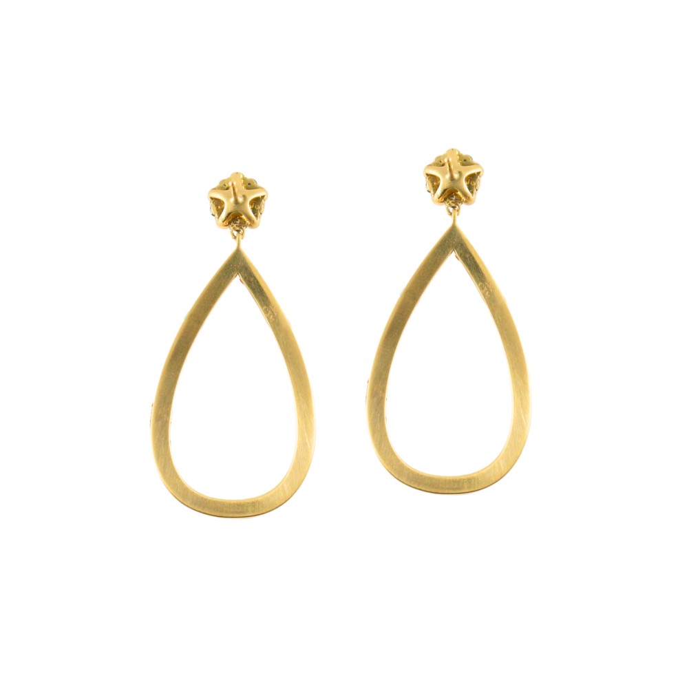 Each featuring green tourmaline and aquamarine cluster, suspended by a pear-shaped pendant, set with mixed round green tourmalines and aquamarines.
