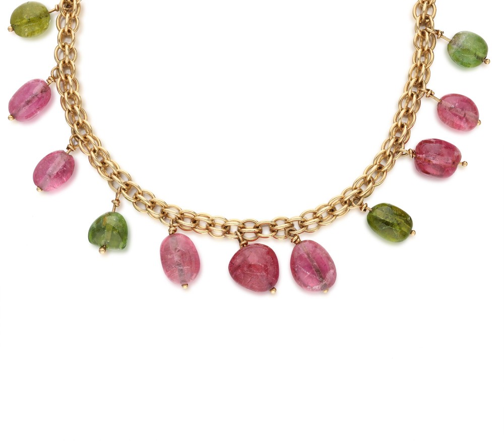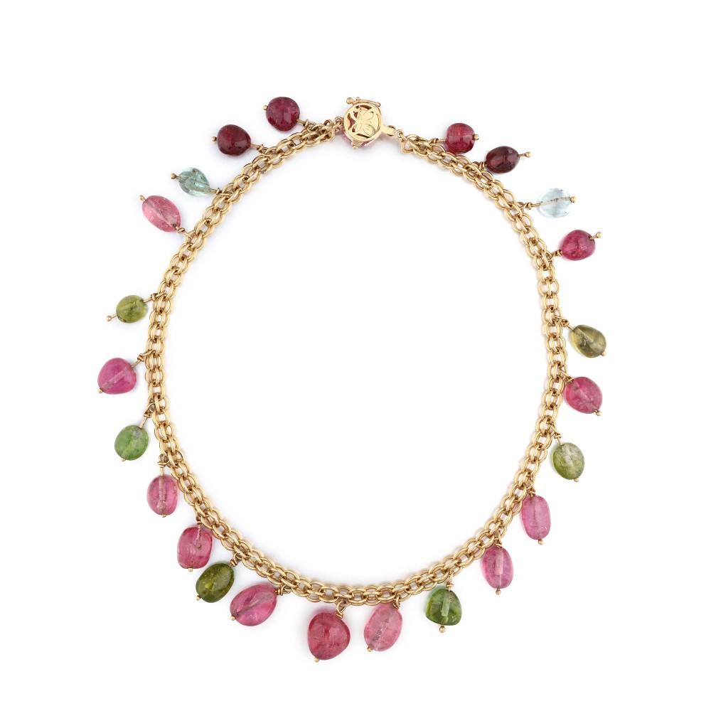 Composed of tumbled pink and green tourmaline beads, accented by two aquamarine beads.