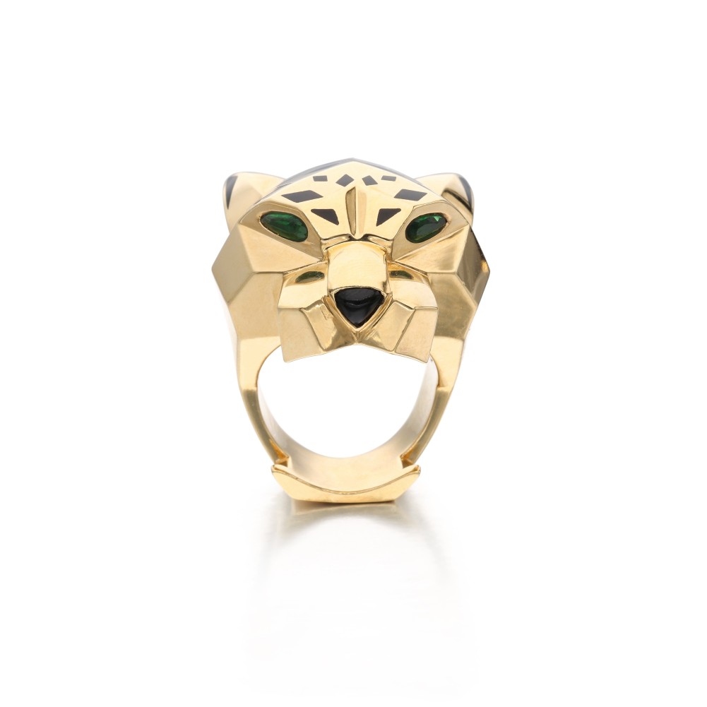 Of the Panth?re de Cartier collection, composed of pear-shaped tsavorite garnets, accented by carved black onyx and black lacquer accents.