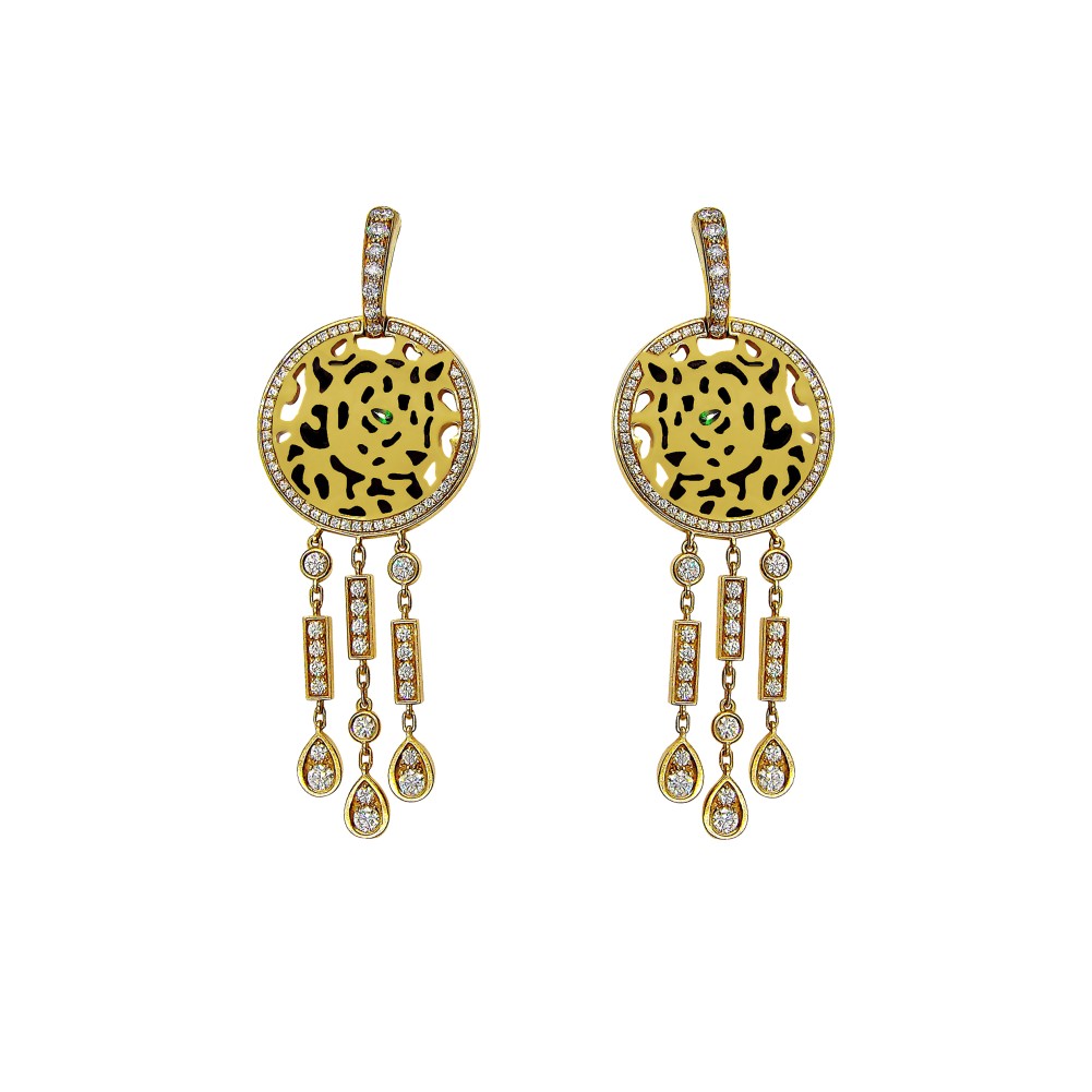 Each featuring a circular pendant with the iconic panther motif and diamond tassels, set with 1 pear-shaped tsavorite as eye, decorated with round brilliant-cut diamonds and black lacquer.
