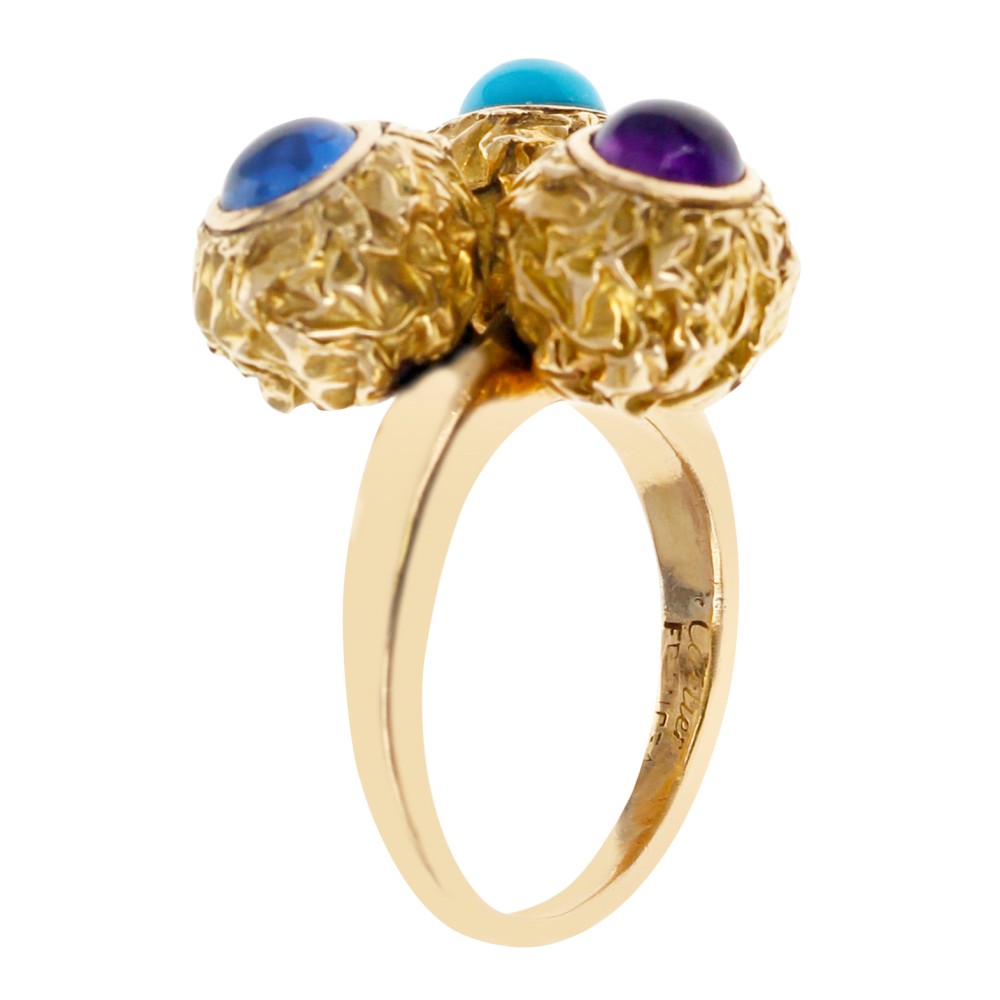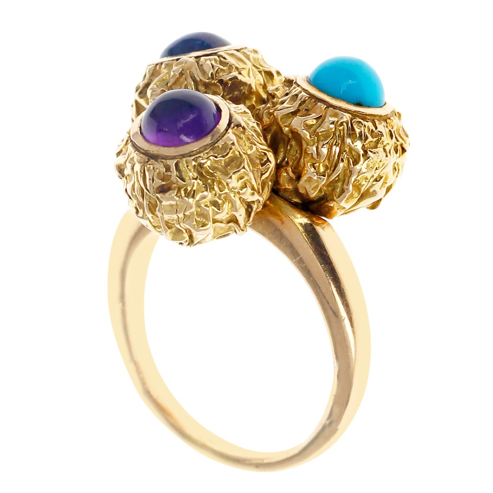 Featuring textured gold, set with turquoise, sapphire and amethyst cabochons.