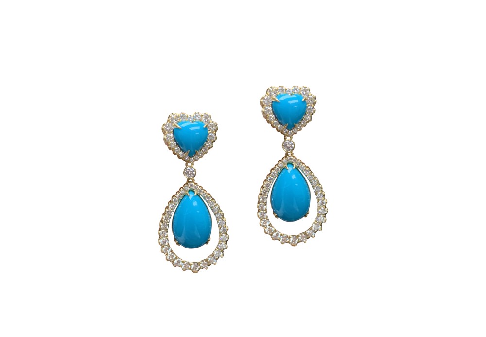 Featuring 1 heart-shaped turquoise cabochon and 1 pear-shaped turquoise cabochon, accented by round brilliant-cut diamonds.