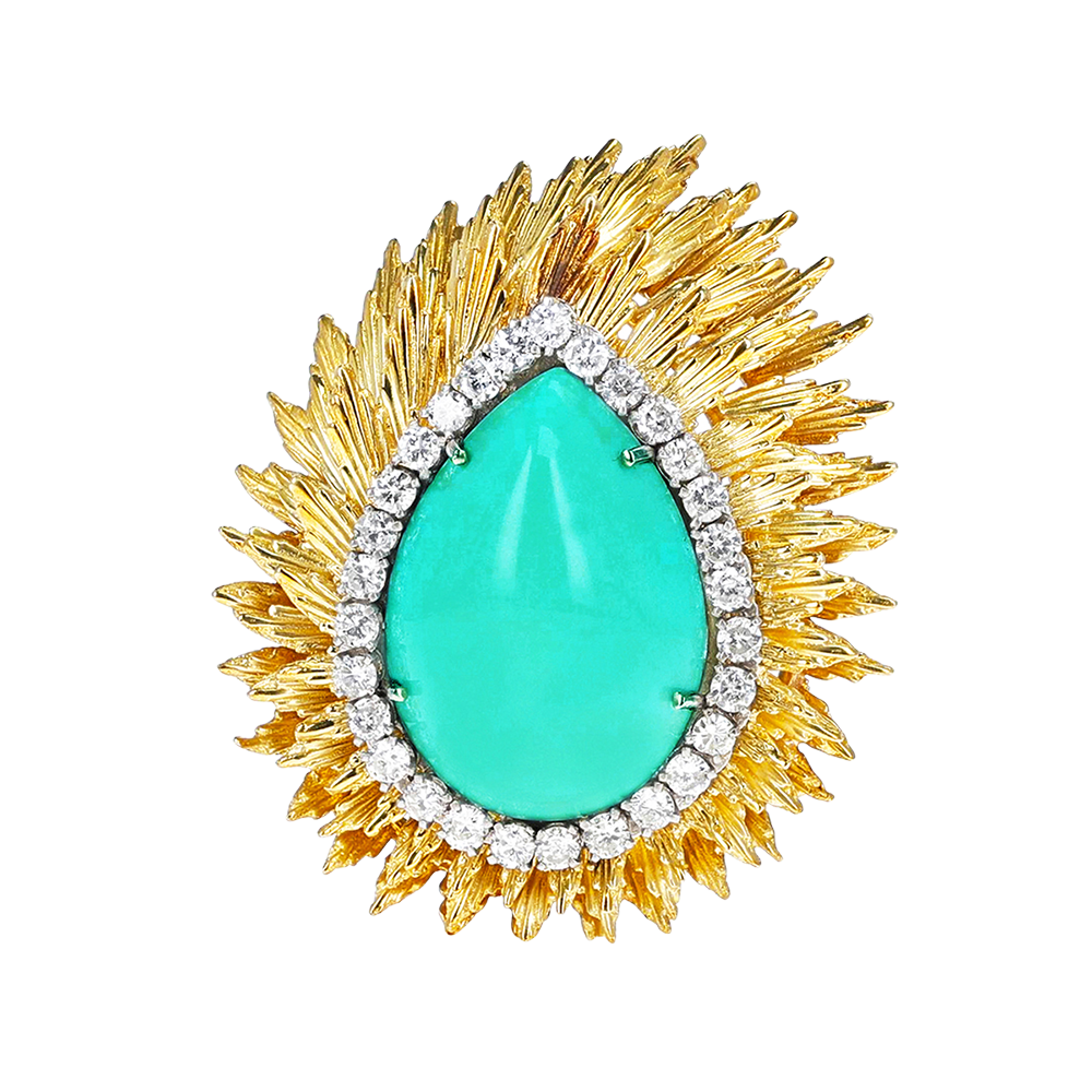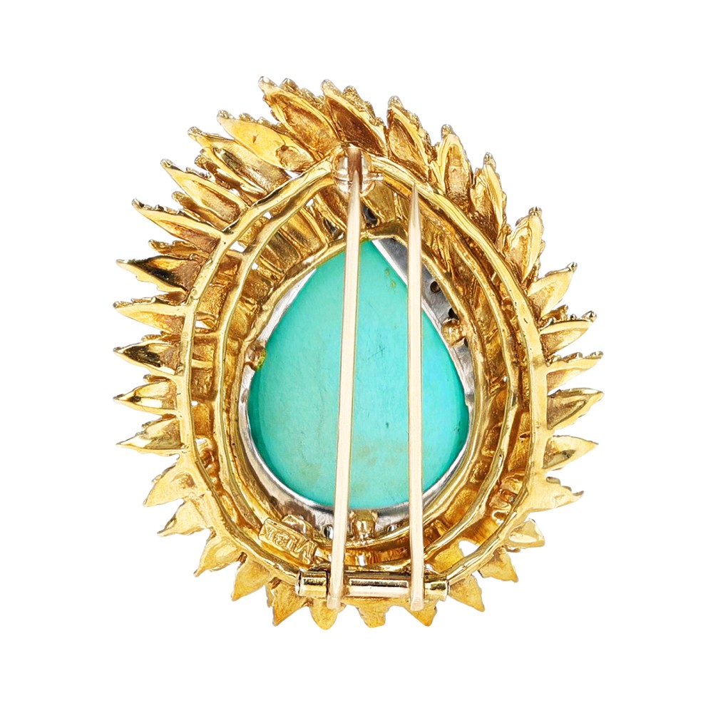 Centering a pear-shaped turquoise accented with a halo of diamonds and textured gold leaves.