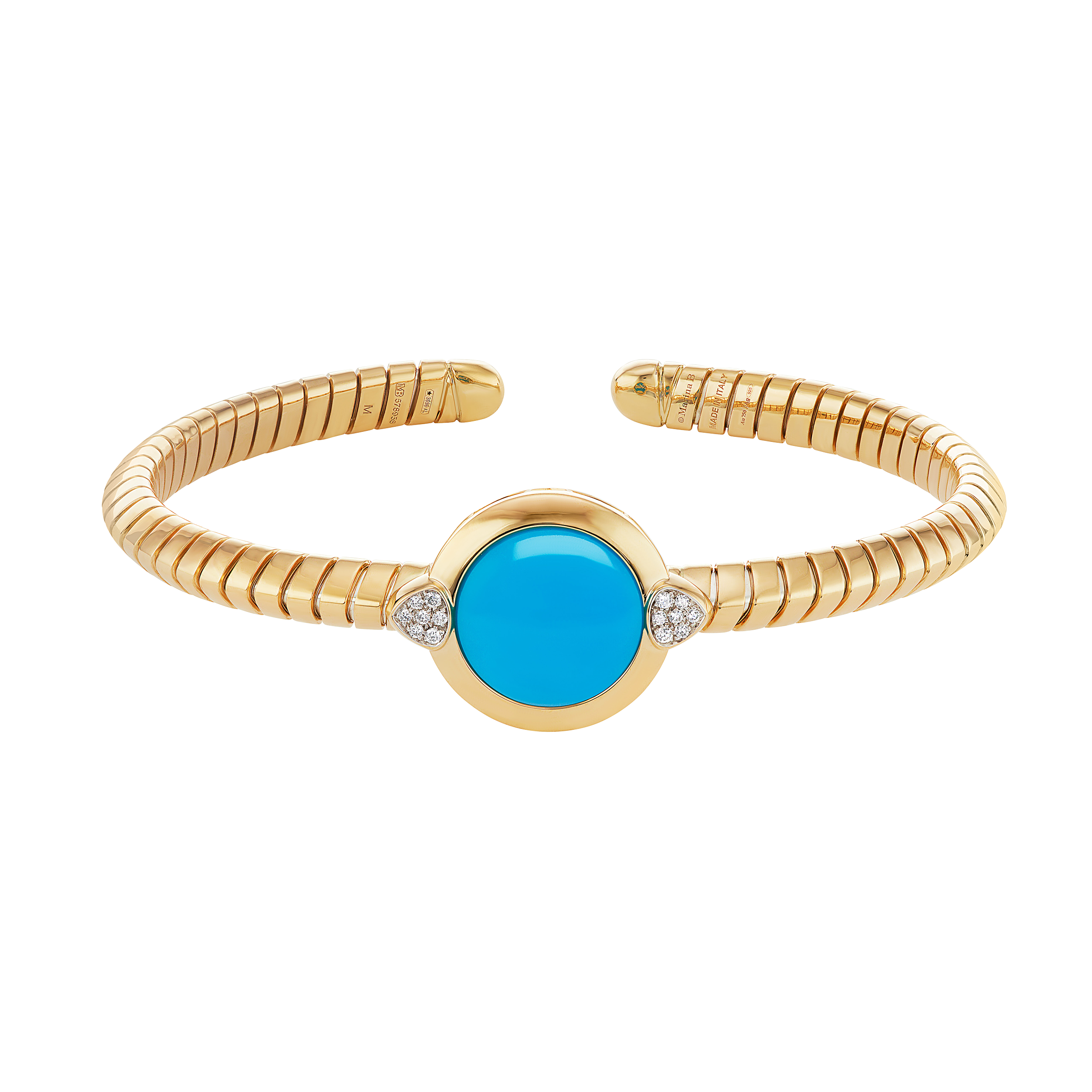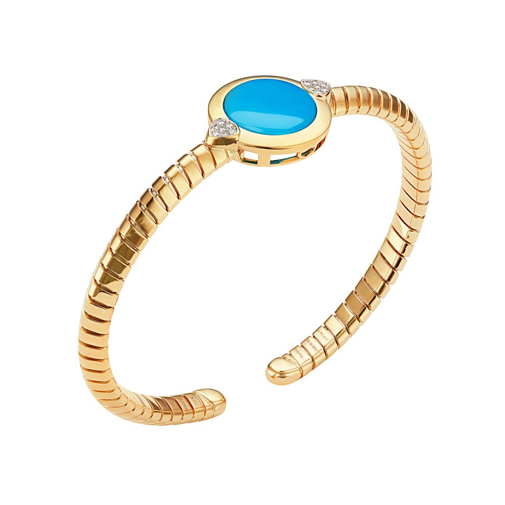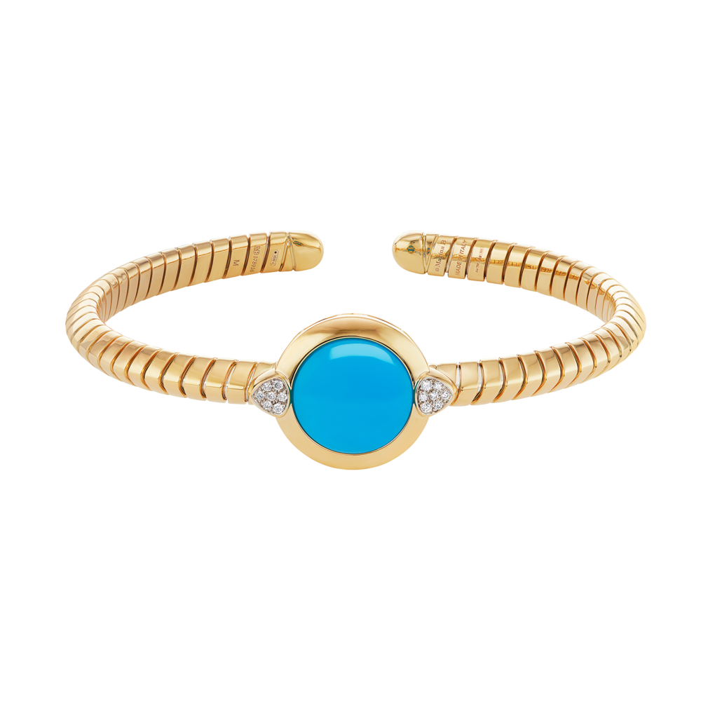 Centering a cabochon turquoise, accented by diamonds.
