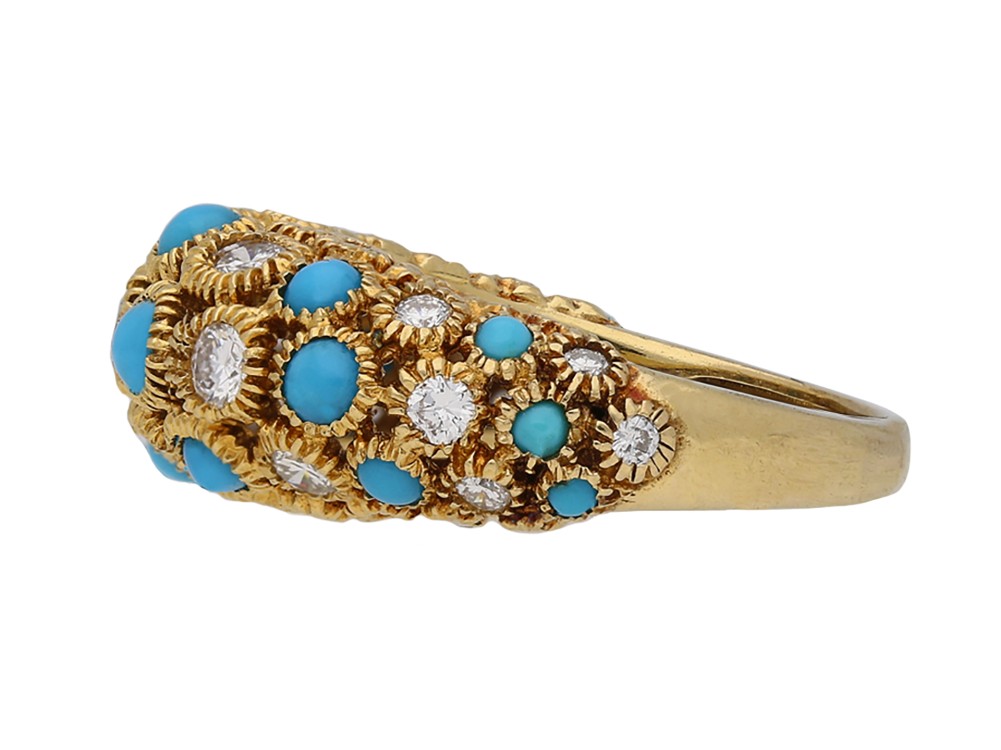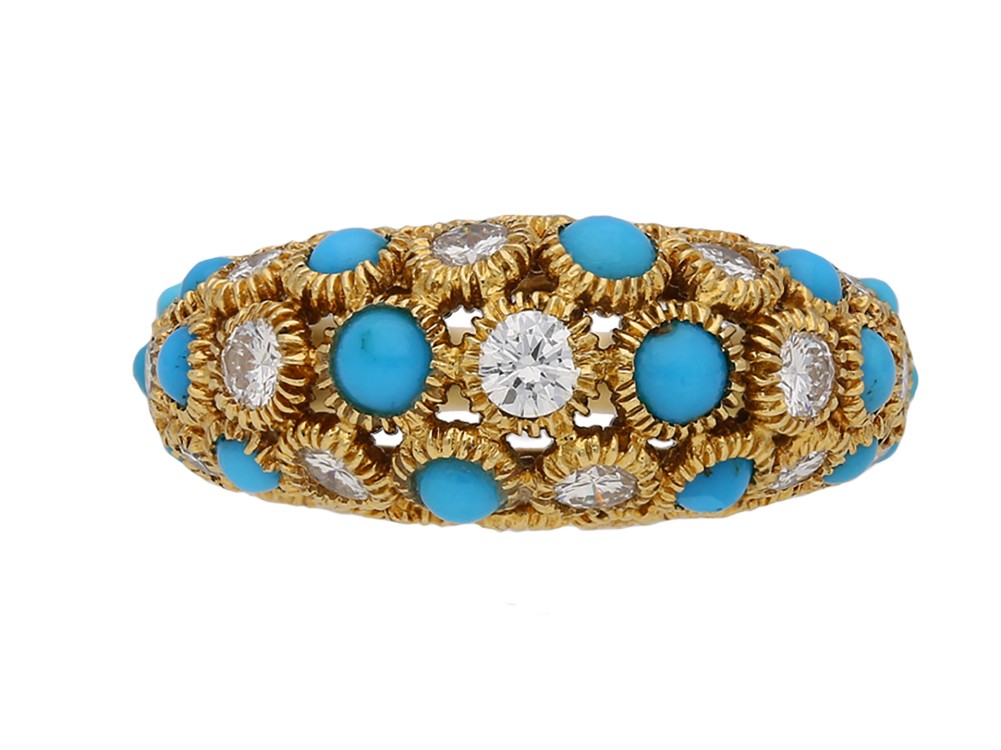 Set with 18 round cabochon natural turquoise of varying sizes in open-back rubover settings, further set with 19 round old-cut diamonds.