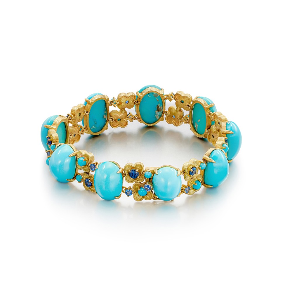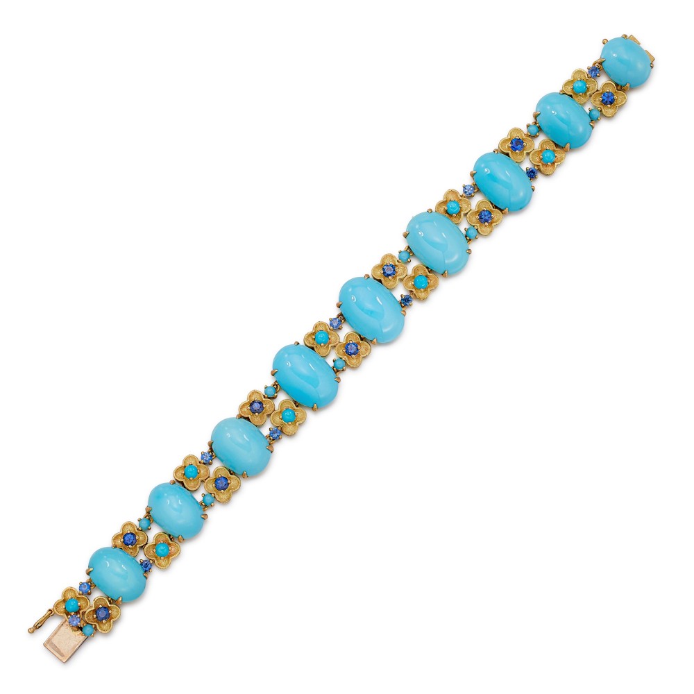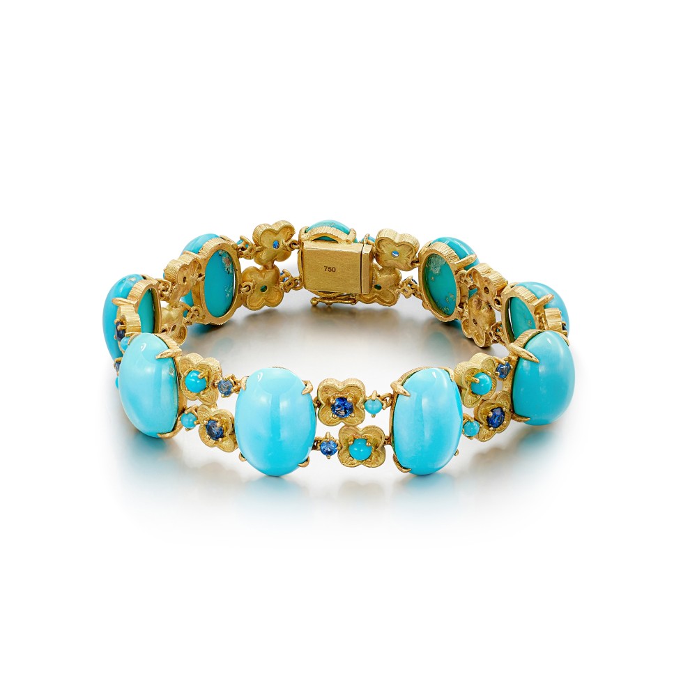 Set with 9 oval cabochon turquoises, accented by 18 round turquoises and 19 sapphires.
