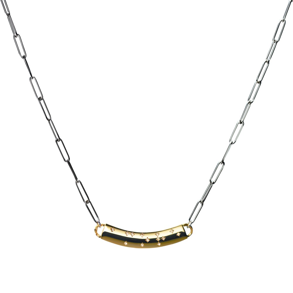 Centering a gold plate set with 13 round diamonds, connected with paperclip chain.