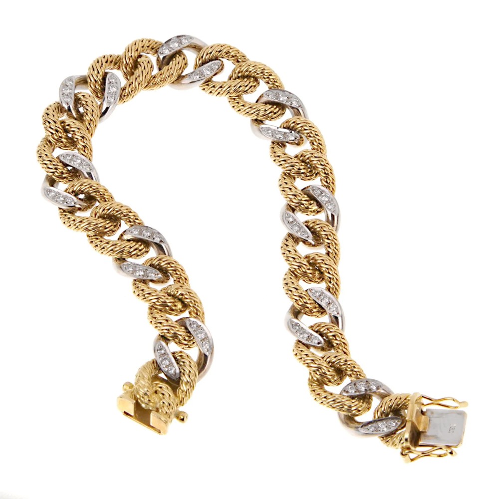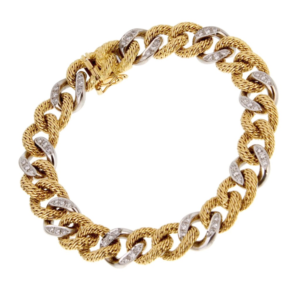 Featuring braided gold and white gold links, accented by round diamonds.