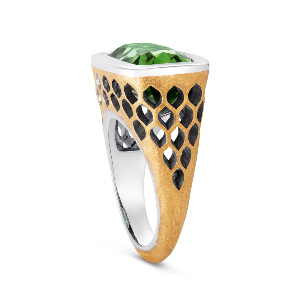 A center stone of seafoam green tourmaline, set in Fairtrade white and yellow gold.