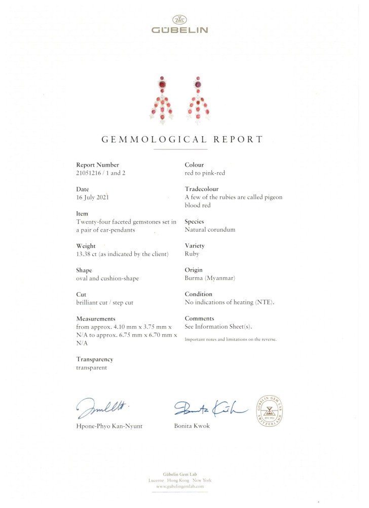 - Accompanied by Gubelin report no. 21051216, dated 16 July 2021, stating that the 13.38 carats of rubies are of Burmese origin showing no indications of heating and stating that a few of the rubies are called pigeon blood red