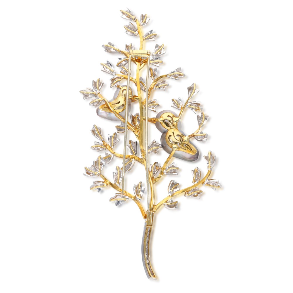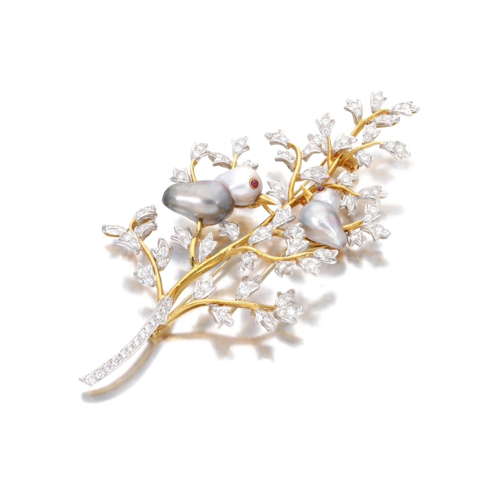 Designed as a branch with 2 standing birds, each bird set with 2 cultured south sea baroque pearls, bezel set ruby eye and beak in yellow gold, branch set with round diamond in both yellow gold and white gold.