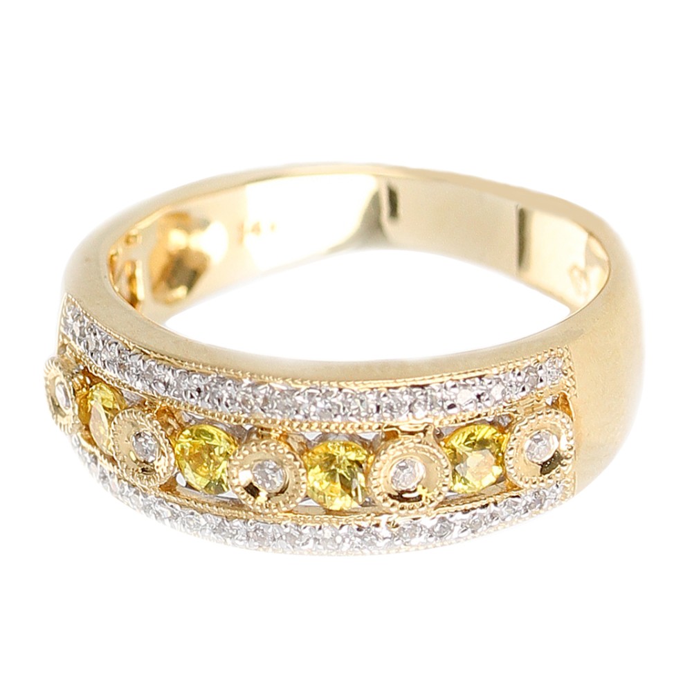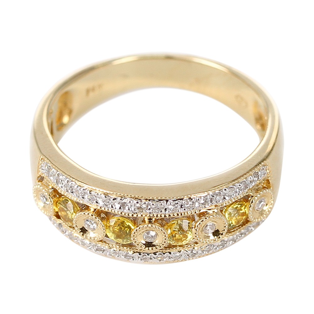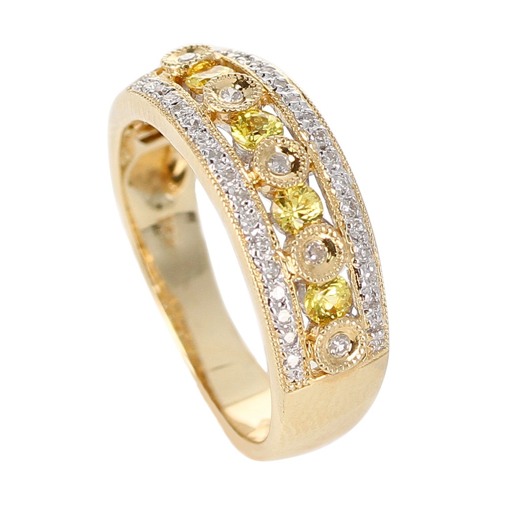 Alternating round yellow sapphires with flush set diamonds, accented by additional round diamonds.