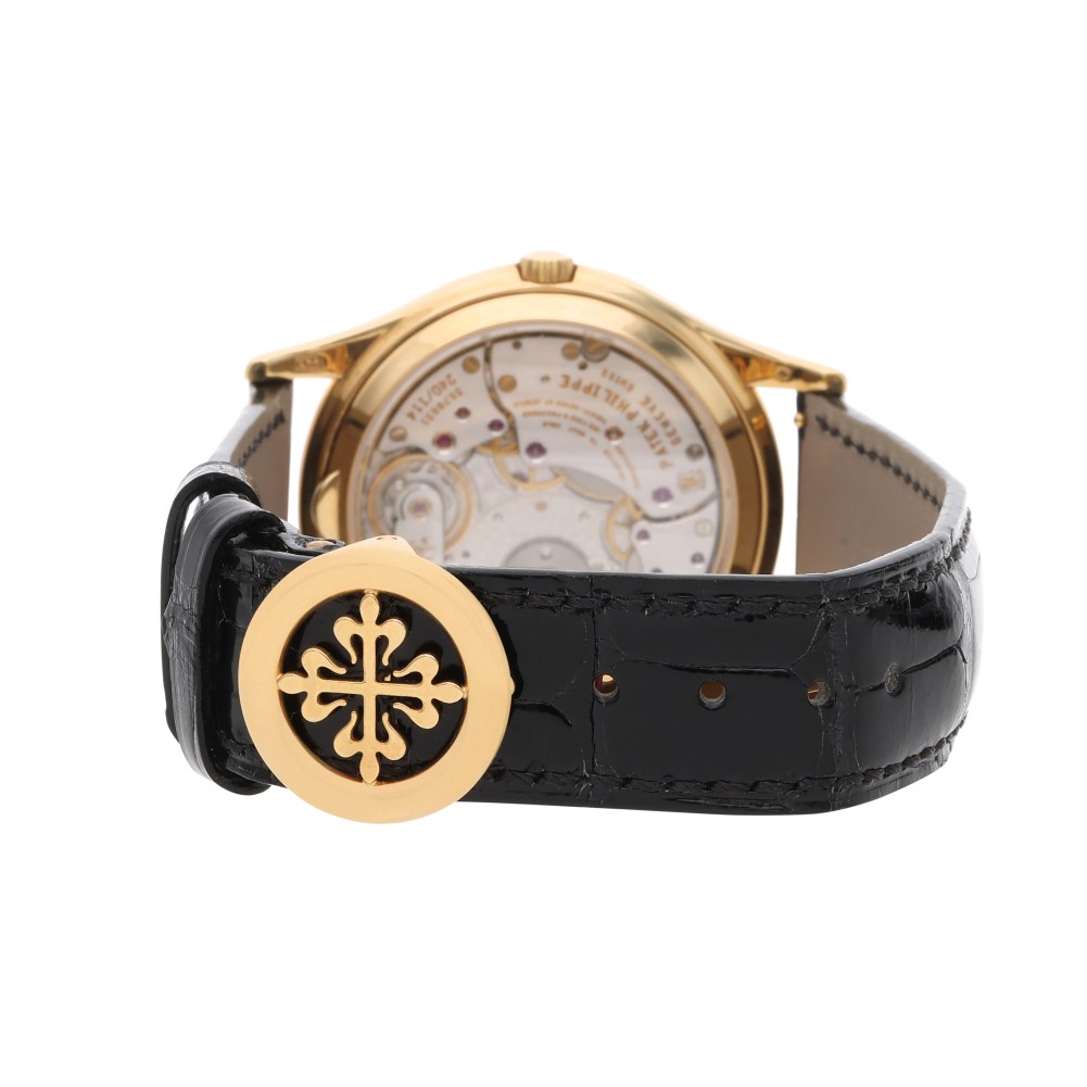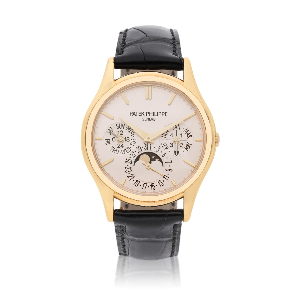 Patek Philippe Grand Complication Perpetual Calendar Reference 5140J-001, 18k yellow gold rare novelty discontinued edition, opaline argente obus 12 dials with gold-applied faceted baton hour markers and outer engraved minute divisions. The subdial for twenty-four hours with the days of the week is at 9 o’clock, the months with leap year is at 3 o’clock, and the moon phase aperture and days of the months are at 6 o’clock self-winding Patek Philippe caliber 240Q automatic movement with gyromax balance-wheel adjusted to cold, heat, isochronism and five positions. Transparent skeleton exhibition case back. Black alligator leather strap with 18k yellow gold foldover deployant buckle. 37.2mm with a thickness of 8.5mm.