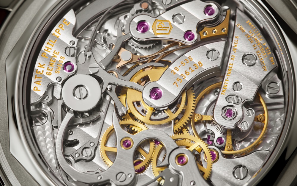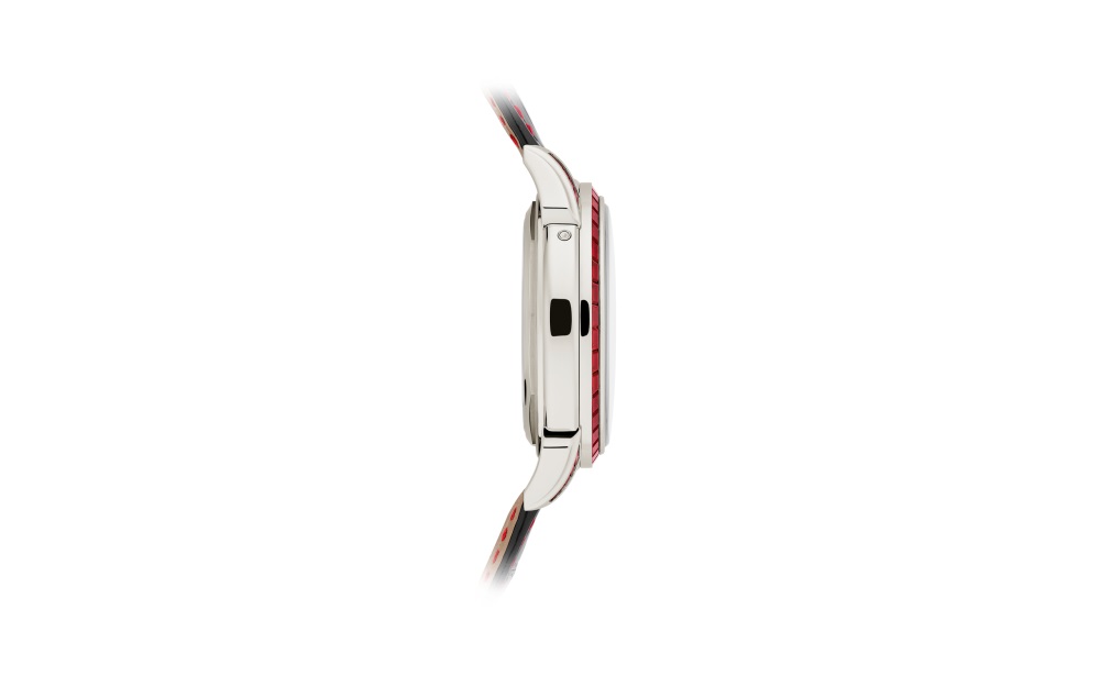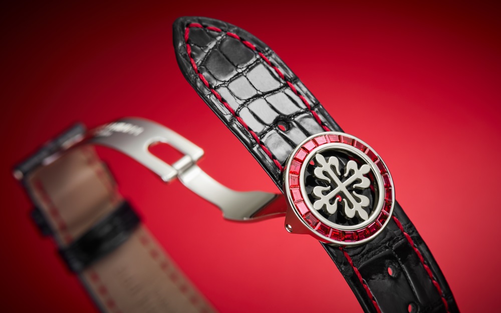A jewelry version of a Patek Philippe classic, Reference 5271/12P-010 is lit up by 80 baguette-cut rubies (5.25 cts) set on the bezel, the lugs and the fold-over clasp. The intense color of the gems is echoed by the lacquered red dial with black-gradient rim and the shiny black alligator strap with contrasting stitching.