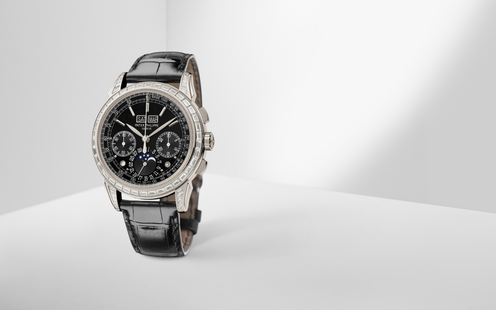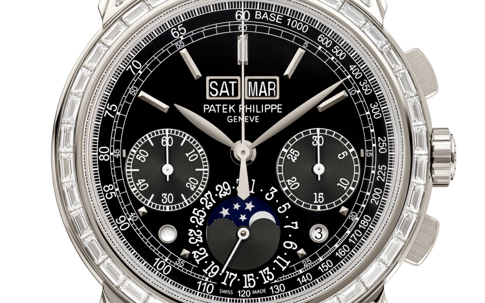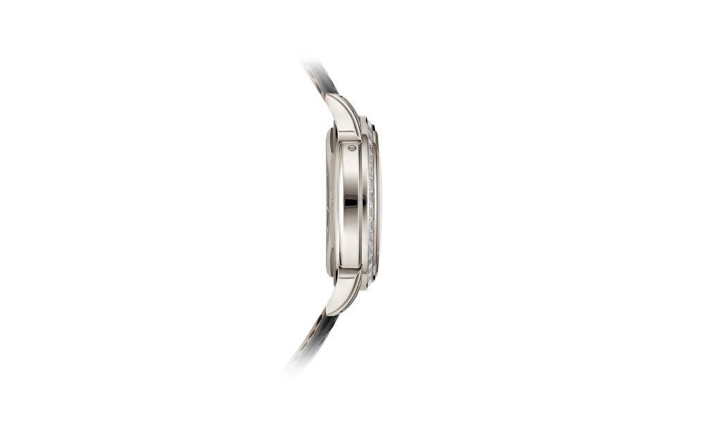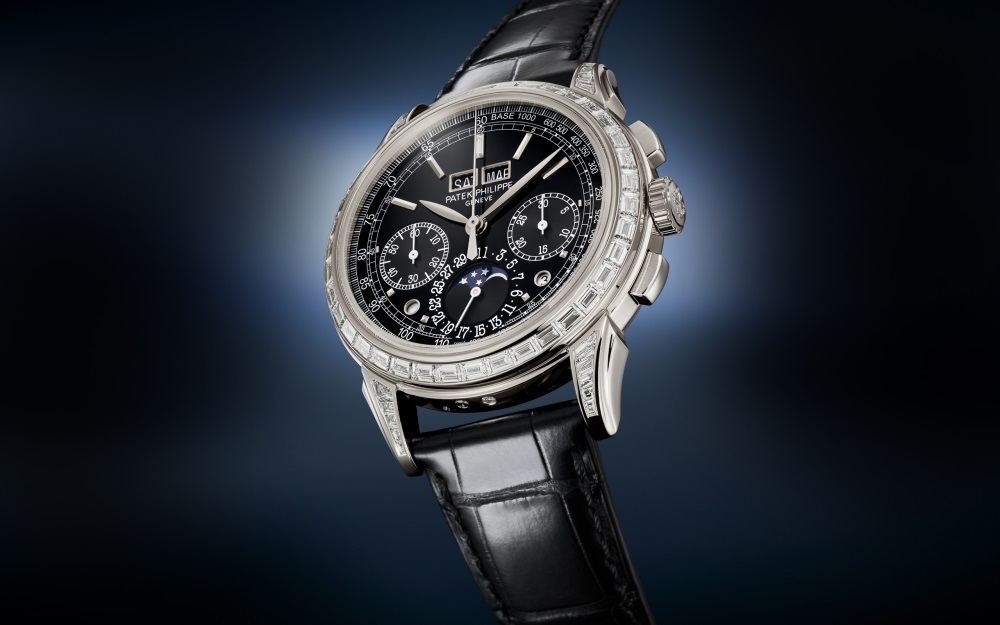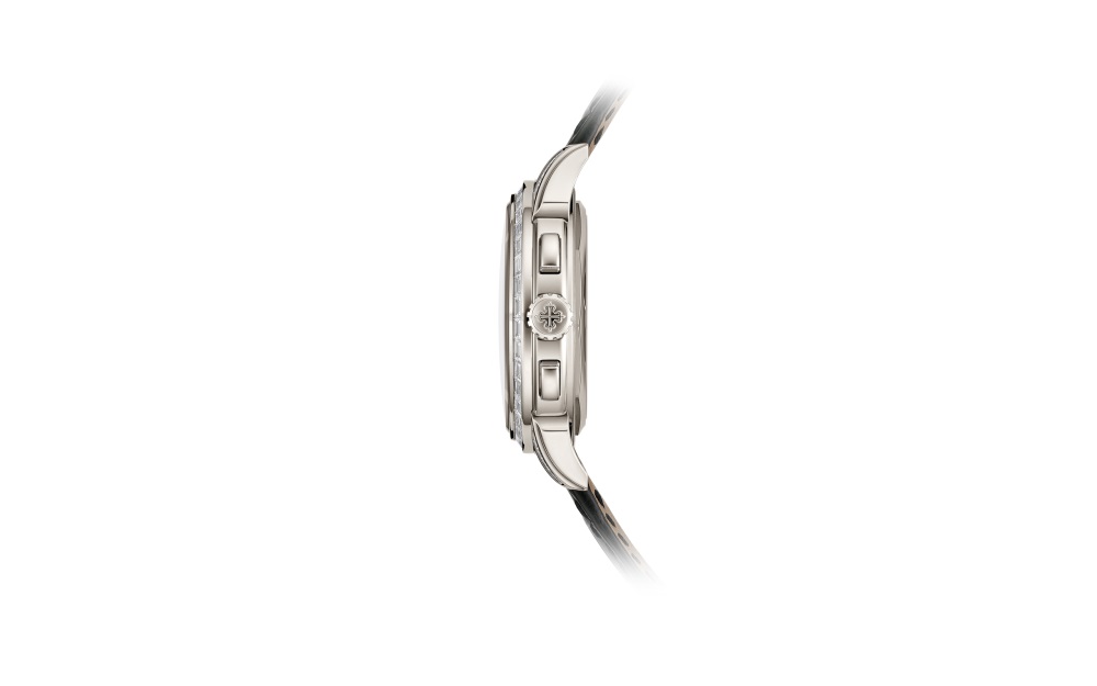 Paying tribute to an iconic Grand Complication, Patek Philippe has created a jewelry version of its chronograph with perpetual calendar Reference 5271, enhanced by 81 baguette-cut diamonds (5.01 cts). The aesthetic harmony is complemented by the lacquered black dial and the shiny black alligator strap.