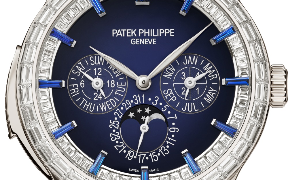 Patek Philippe brilliantly reinterprets Reference 5374 ? a combination of two highly sought-after major complications ? in a new platinum Haute Joaillerie version with a blue-lacquered dial. The case with its subtle play on curves is paved with baguette-cut diamonds tracing a luminous geometrical pattern. The concave bezel adorned with a double row of baguette diamonds forms a perfect circle. The dial flange is also set with baguette diamonds, with baguette blue sapphires on the hour-markers. This original design forms an ?amphitheater? around the dial and creates a spectacular depth effect. The visual balance of the perpetual calendar indications shown by hands, standing out against the blue-lacquered background with black-gradient rim, is thus particularly highlighted.