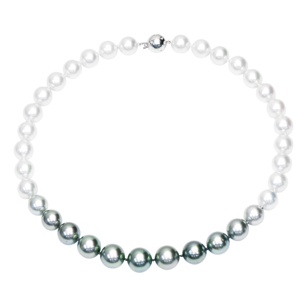 Featuring 34 white South Sea and Tahitian pearls arranged in an ombr? gradient with a diamond-set orb clasp.