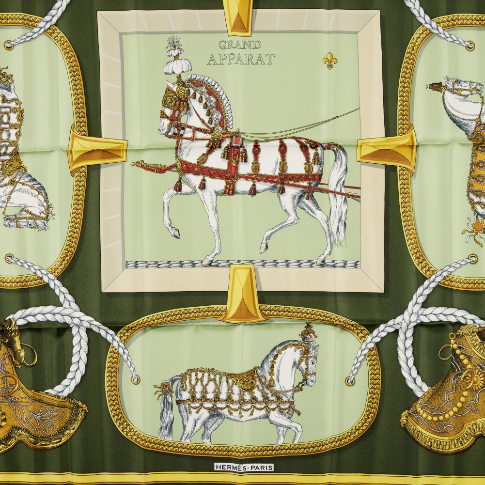 Herm?s Green and Gold Grand Apparat Silk Scarf