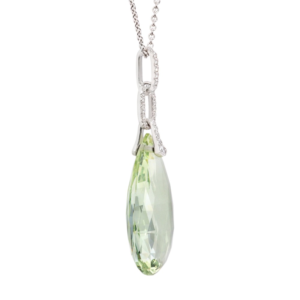 Featuring a teardrop-shaped green beryl accented by 31 round white diamonds.