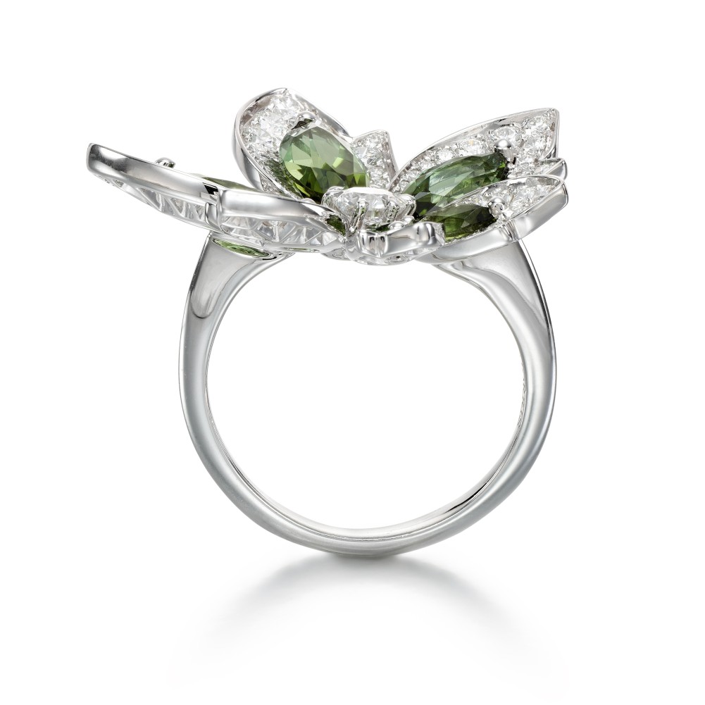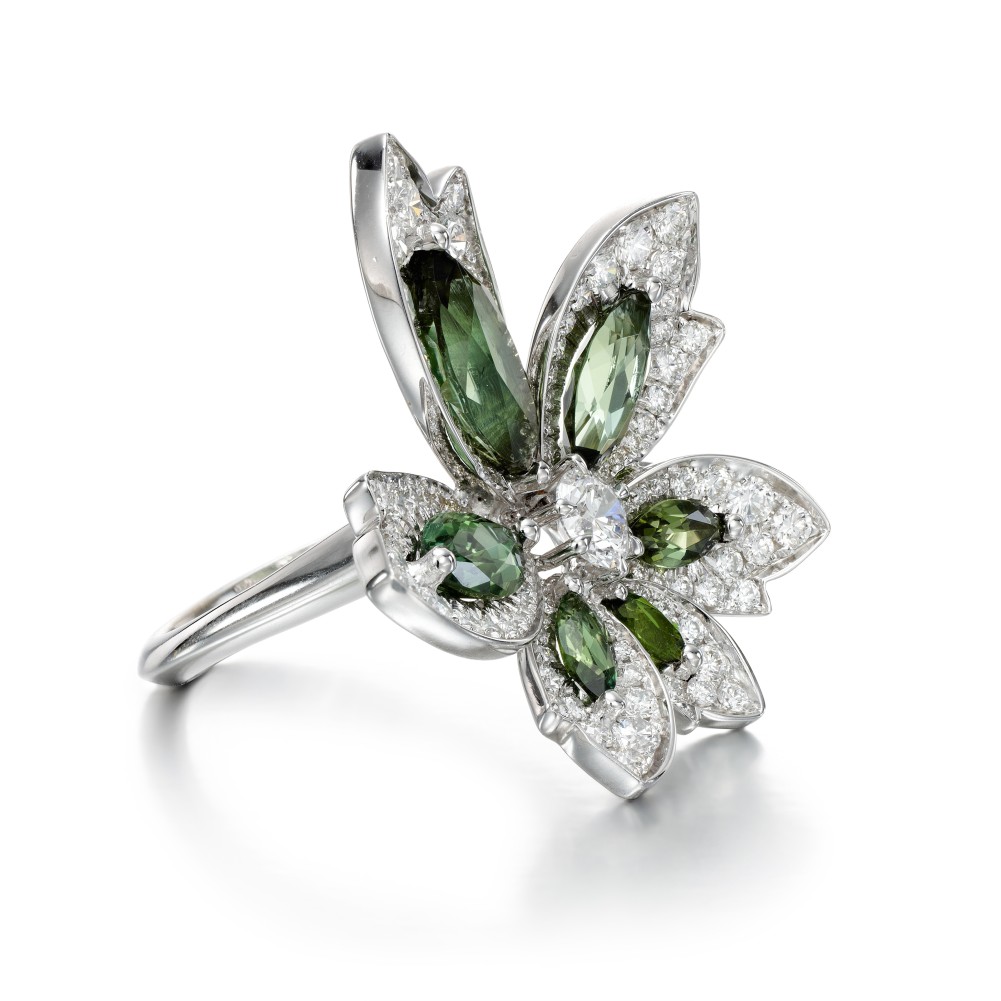 Outlined in micro-set diamonds, the Palm ring is designed to mimic the fan-like fronds of a palm leaf as they reach upwards towards the sun. Crafted with an organic beauty, the palm leaf is imbued with a real sense of life and movement for a light and elegant statement.