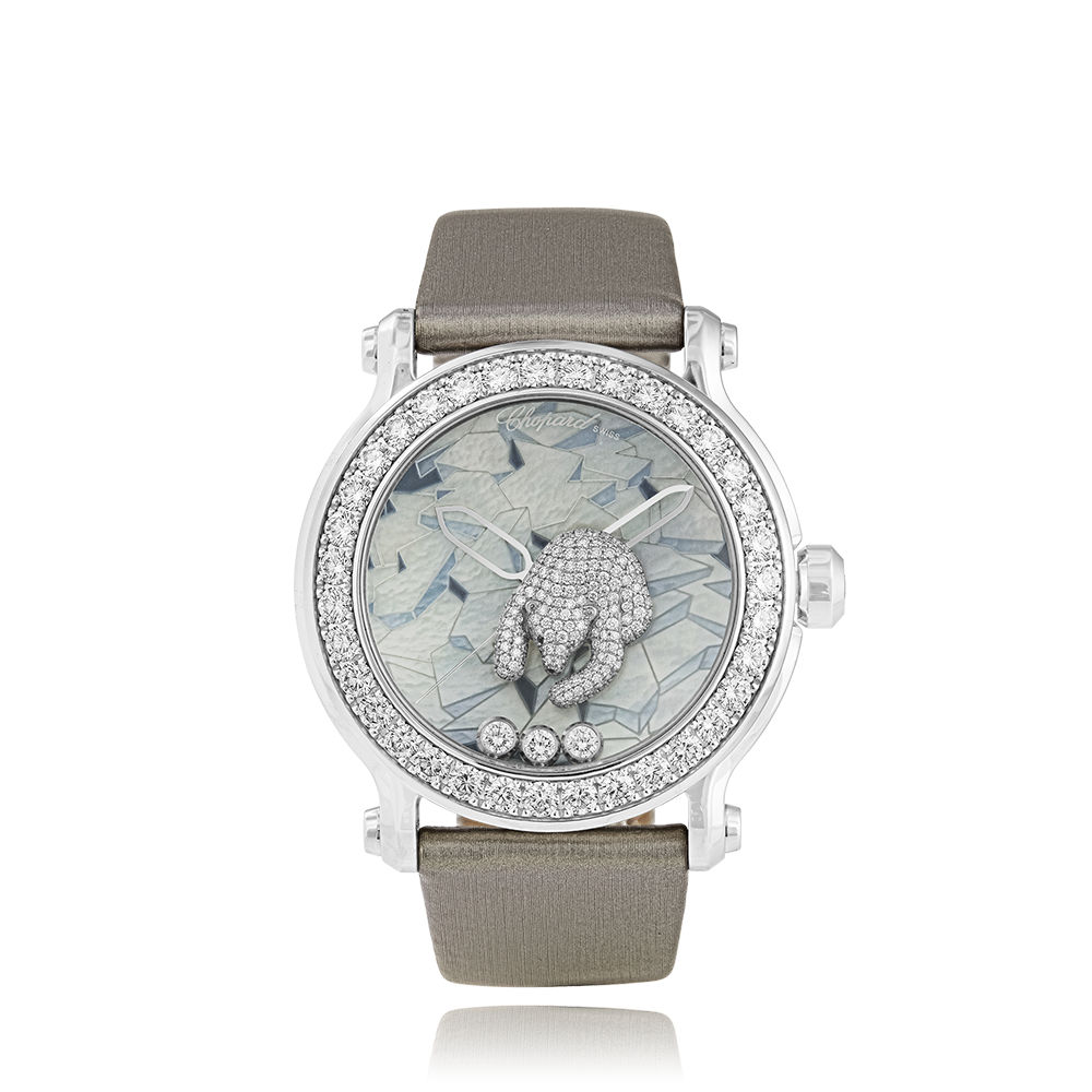 Chopard Happy Sport with a 42 mm white gold case and a sapphire glass, water resistant; inside is the quartz calibre q, a mother-of-pearl face without date indication, the bracelet is a fabric ; accessory: sales box (original), sales guarantee (original).