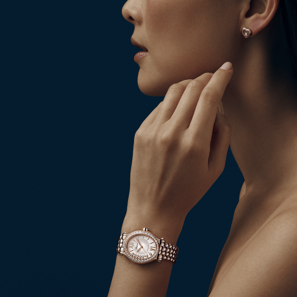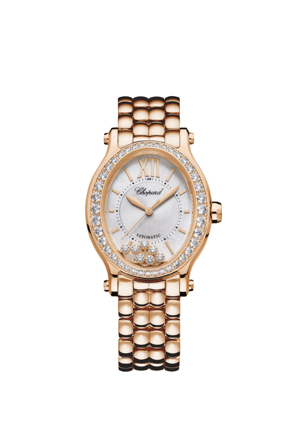 The Happy Sport collection is the emblem of Chopard?s creativity and boldness. Its playful, free-spinning gems, dancing between two sapphire crystals, have captured the imagination since 1993, when Chopard became the first Maison to combine steel and diamonds. Its watchmaking expertise has enabled Chopard to equip the Happy Sport Oval with a mechanical movement featuring an automatic winding mechanism specially developed for feminine cases. Little Diamonds Do Great Things