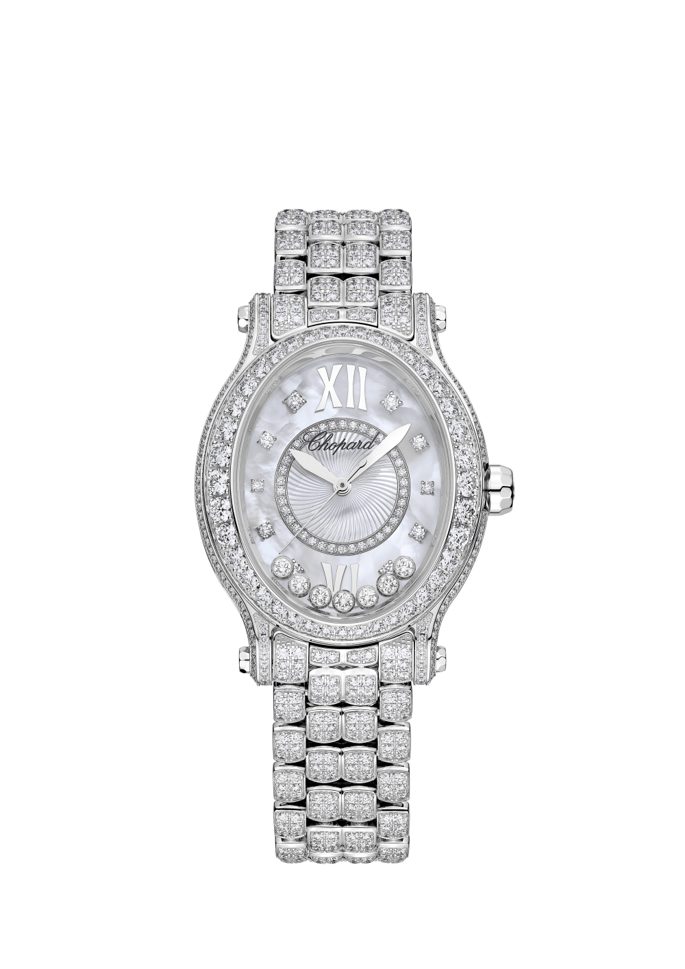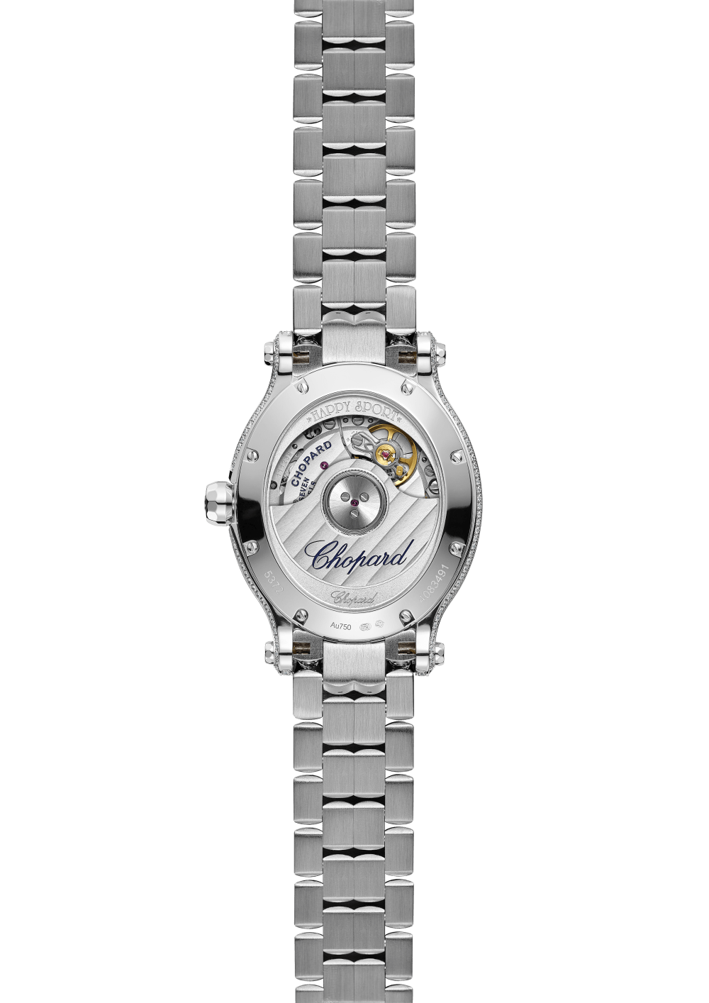 The Happy Sport collection is the emblem of Chopard?s creativity and boldness. Its playful, free-spinning gems, dancing between two sapphire crystals, have captured the imagination since 1993, when Chopard became the first Maison to combine steel and diamonds. Its watchmaking expertise has enabled Chopard to equip the Happy Sport Oval with a mechanical movement featuring an automatic winding mechanism specially developed for feminine cases. Little Diamonds Do Great Things