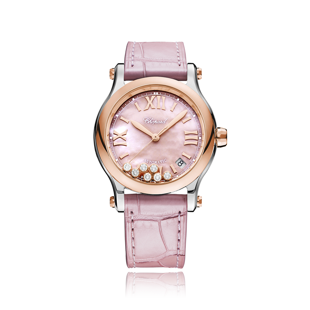 Chopard Happy Sport with a 36 mm bicolour case and a sapphire glass, water resistant; inside is the automatic calibre , a mother-of-pearl roman / index face without date indication, the bracelet is a alligator leather; accessory: sales guarantee (original), sales box (original).