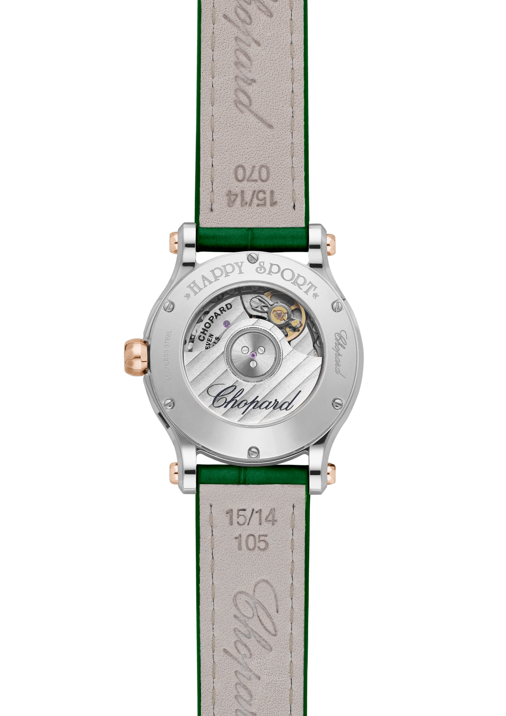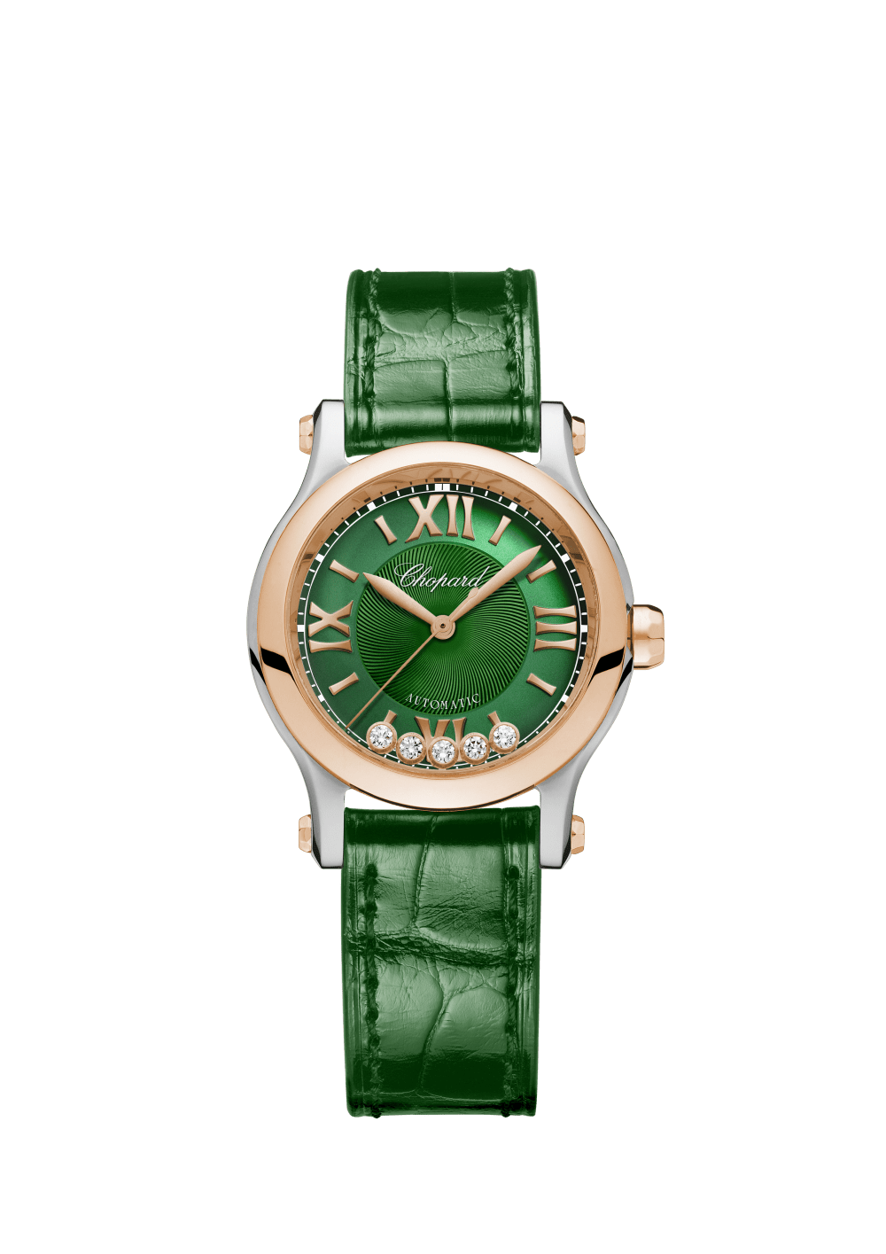 The Happy Sport floating diamond watch collection is the emblem of Chopard?s creativity and boldness. Its playful, free-spinning gems, dancing between two sapphire crystals, have captured imaginations since 1993, when Chopard became the first Maison to combine steel and diamonds. Its watchmaking expertise has enabled Chopard to equip the 30 mm Happy Sport diamond watch with a mechanical movement with automatic winding specially developed for feminine watch cases. Little Diamonds Do Great Things.