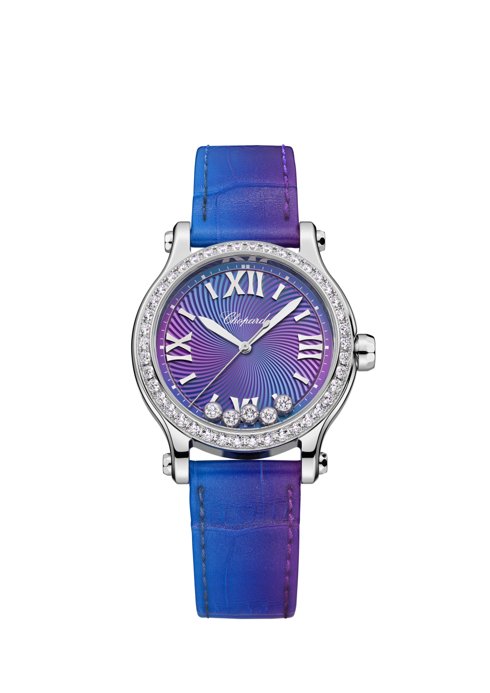 The Happy Sport women’s floating diamond watch collection is the emblem of Chopard?s creativity and boldness. Dancing between two sapphire crystals, the playful, free-spinning diamonds have captured the imagination since 1993, when Chopard became the first Maison to combine steel and diamonds. Its watchmaking expertise has enabled Chopard to equip the Happy Sport 33 mm watch with a mechanical movement with automatic winding specially developed for feminine cases. Little Diamonds Do Great Things.