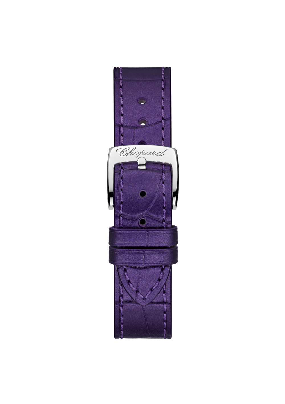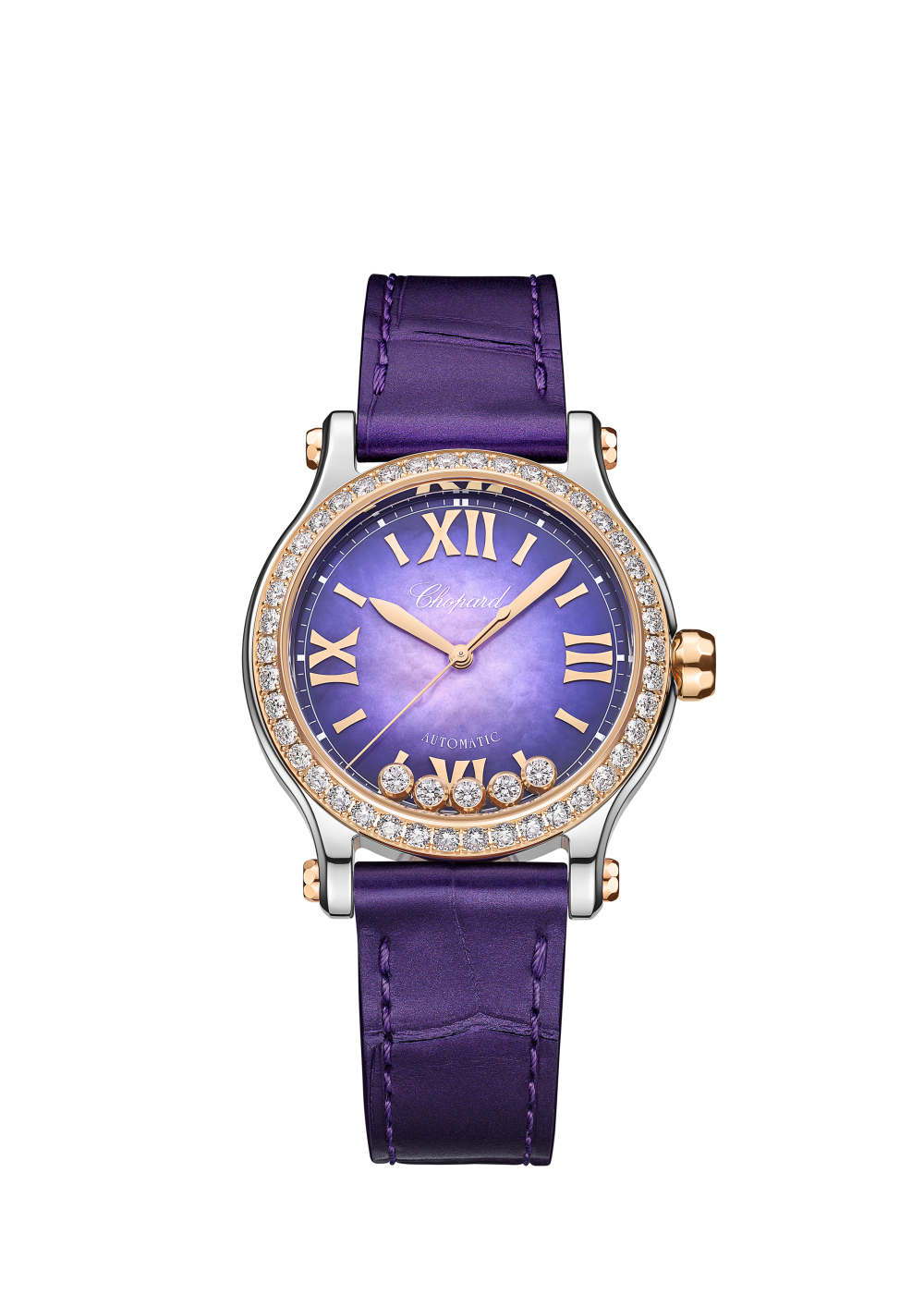 The Happy Sport women’s floating diamond watch collection is the emblem of Chopard?s creativity and boldness. Dancing between two sapphire crystals, the playful, free-spinning gems of this rose gold and Lucent Steel? watch have captured the imagination since 1993, when Chopard became the first Maison to combine steel and diamonds. Its watchmaking expertise has enabled Chopard to equip the Happy Sport 33 mm watch with a mechanical movement with automatic winding specially developed for feminine cases. Little Diamonds Do Great Things.
