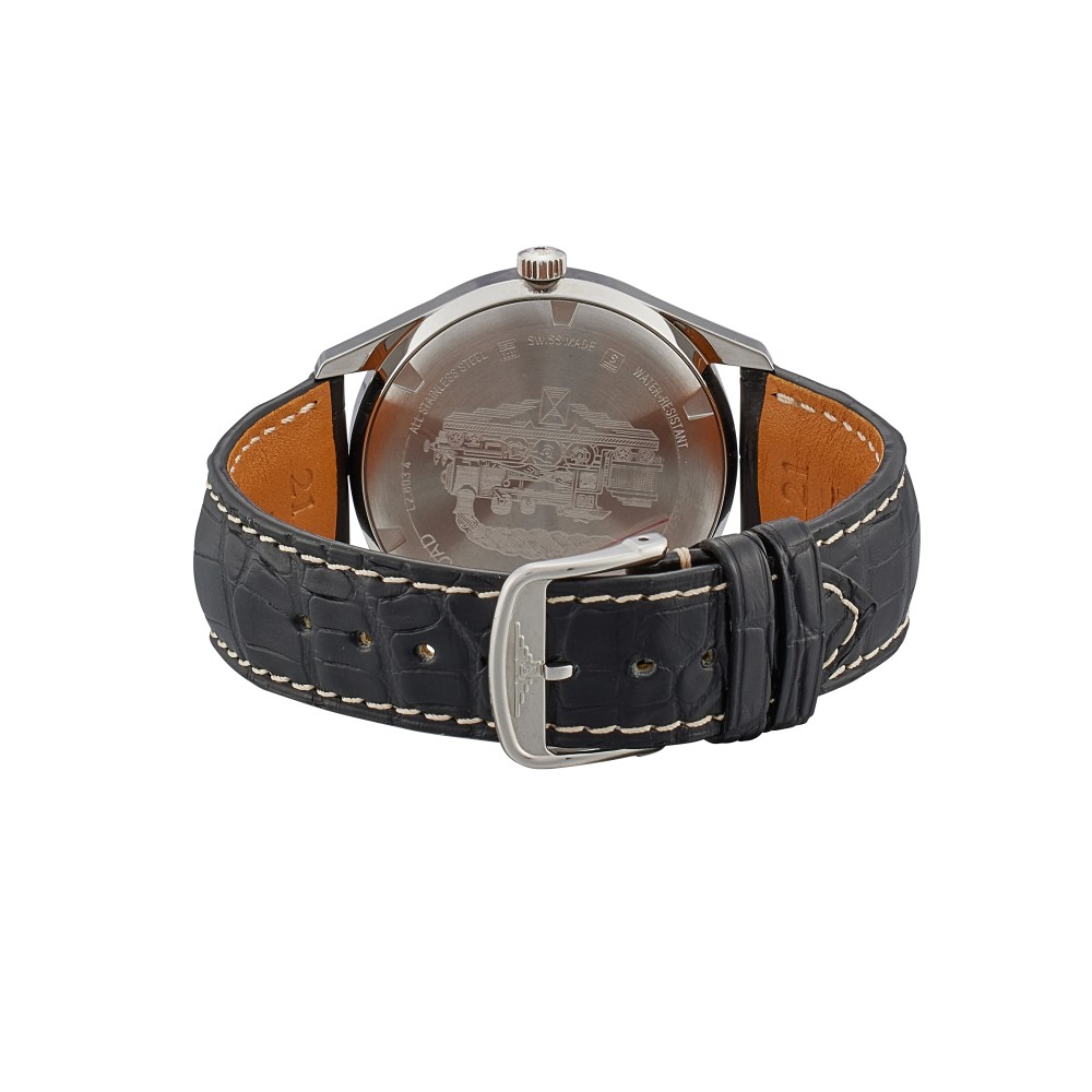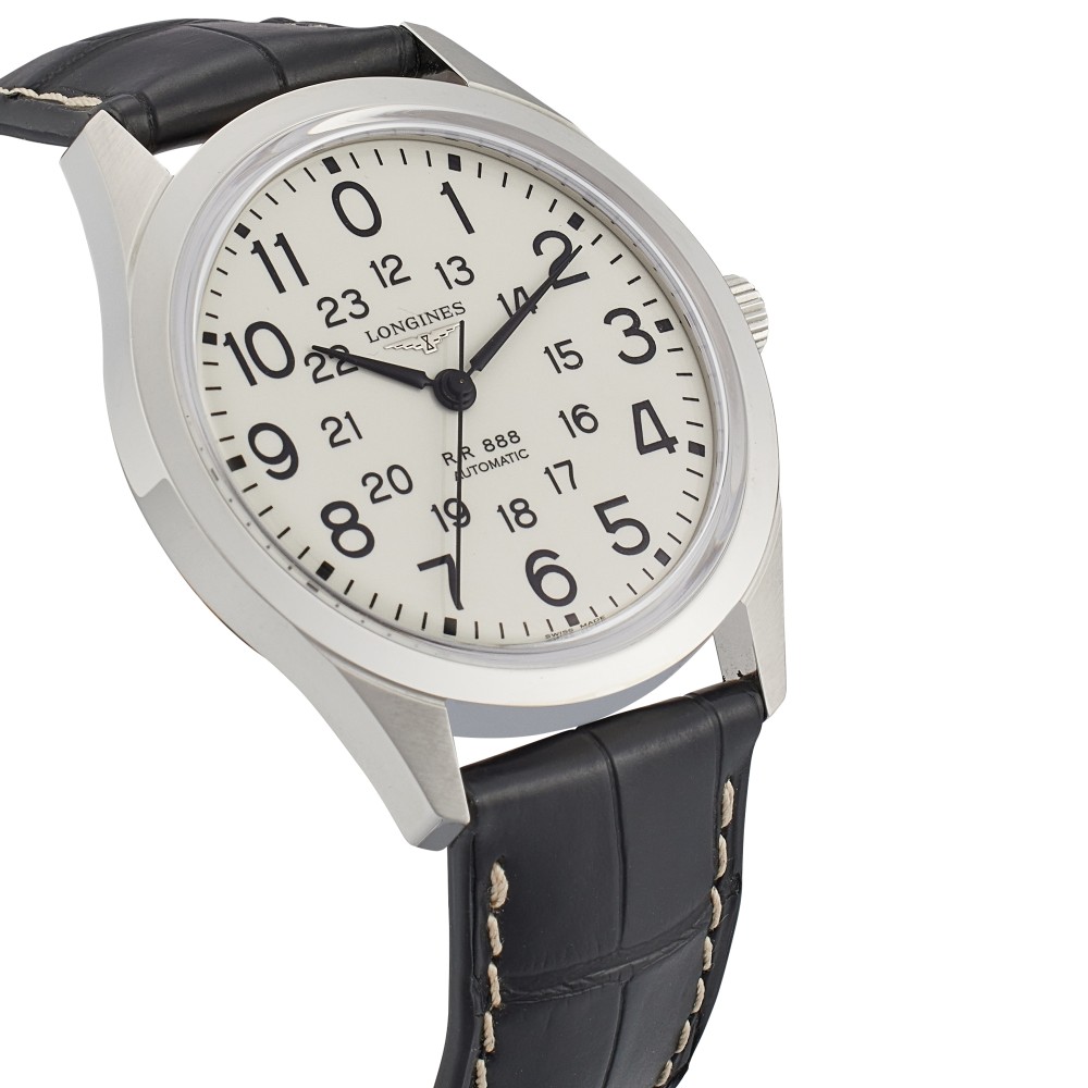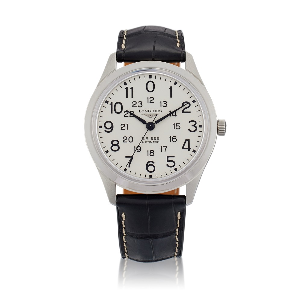 Heritage Railroad reference L28034230 is a stainless steel automatic wristwatch, circa 2023, with caliber 619/888 automatic movement. This Heritage watch delivers outstanding performance and provides a 64-hour power reserve. Water resistant approximately 30 meters. Robust 40mm stainless steel case, white dial, equipped with contrasting black hands and black Arabic numerals. Complete with sapphire crystal glass for protection and black alligator leather strap. This watch comes with paper and box.
