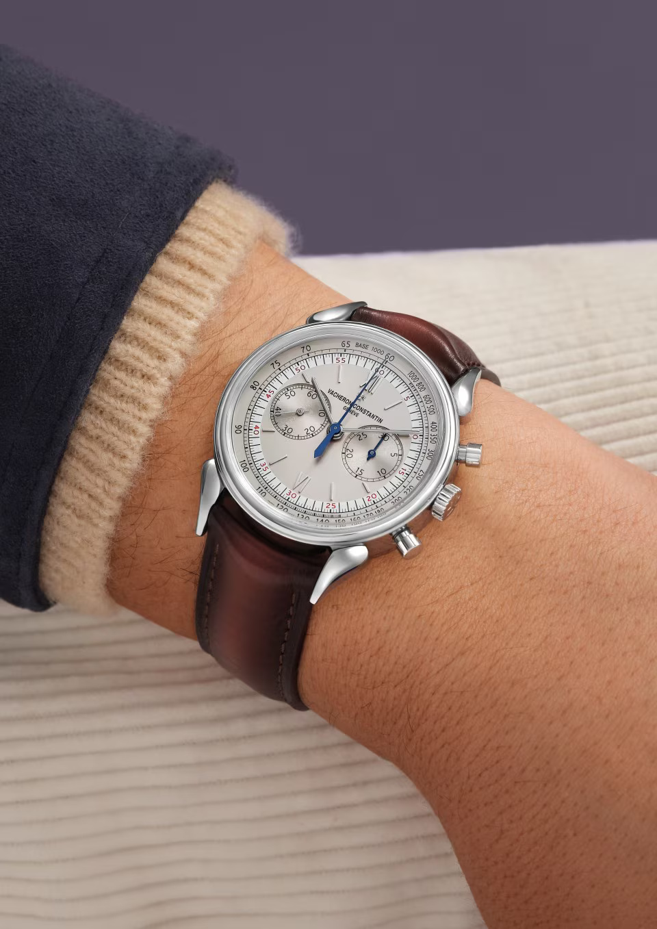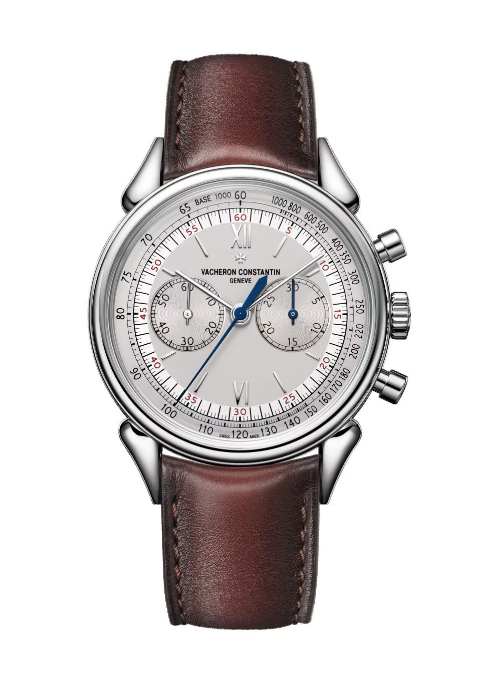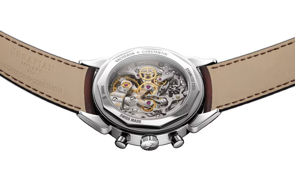 This watch in steel pays tribute to the legendary and assertive ?cow horns? that adorned the 1955 manual-winding chronograph, reference 6087, the first water-resistant chronograph manufactured by Vacheron Constantin. Painted on the dial, the tachymeter scale makes it possible to determine an average speed thanks to the central hand of the chronograph. Rare and authentic, its calfskin-leather strap was developed by Serapian, a Maison from Milan dear to Vacheron Constantin.