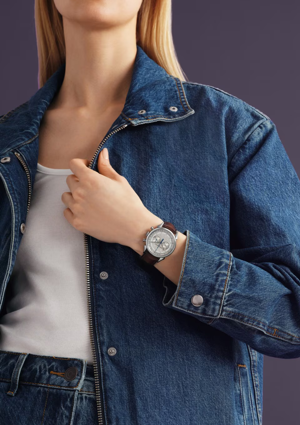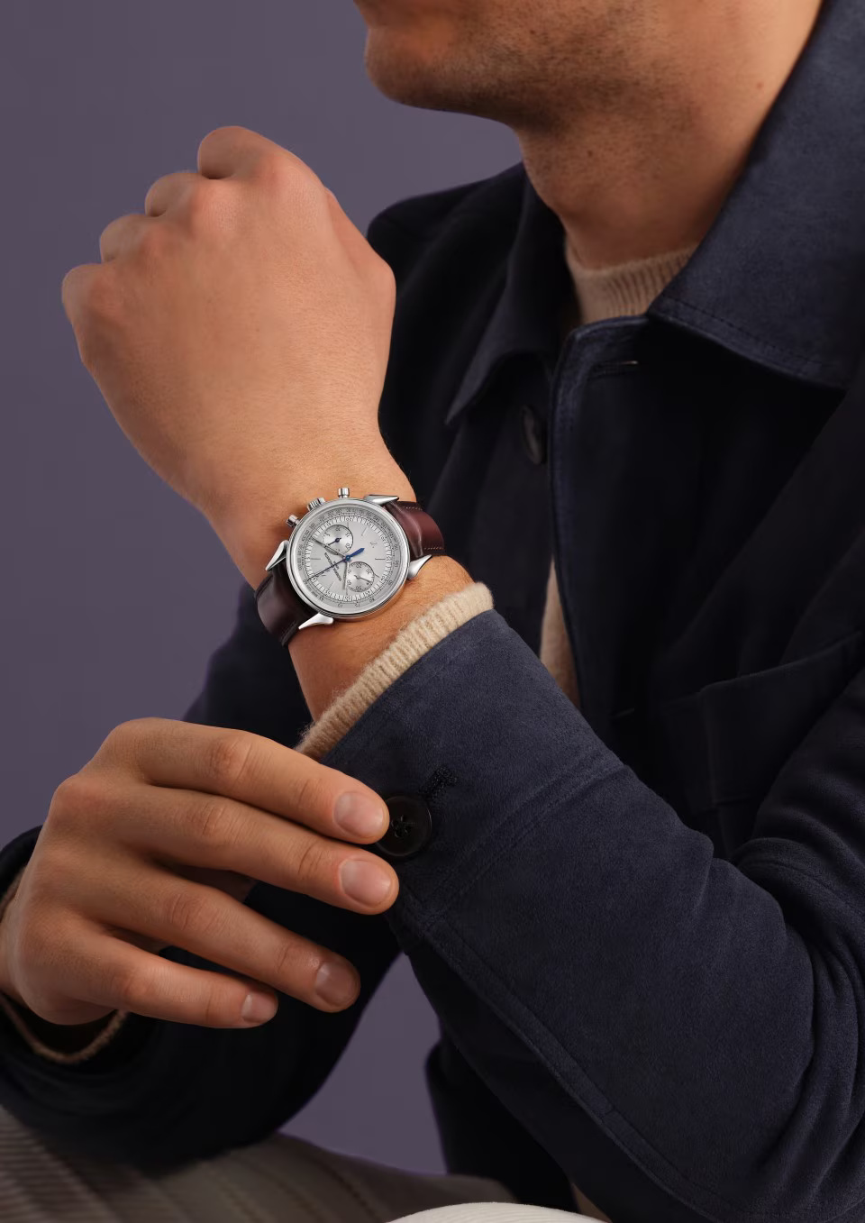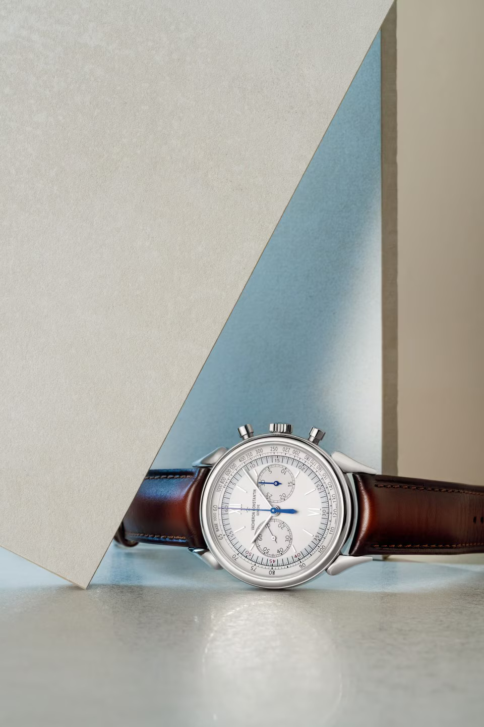 This watch in steel pays tribute to the legendary and assertive ?cow horns? that adorned the 1955 manual-winding chronograph, reference 6087, the first water-resistant chronograph manufactured by Vacheron Constantin. Painted on the dial, the tachymeter scale makes it possible to determine an average speed thanks to the central hand of the chronograph. Rare and authentic, its calfskin-leather strap was developed by Serapian, a Maison from Milan dear to Vacheron Constantin.