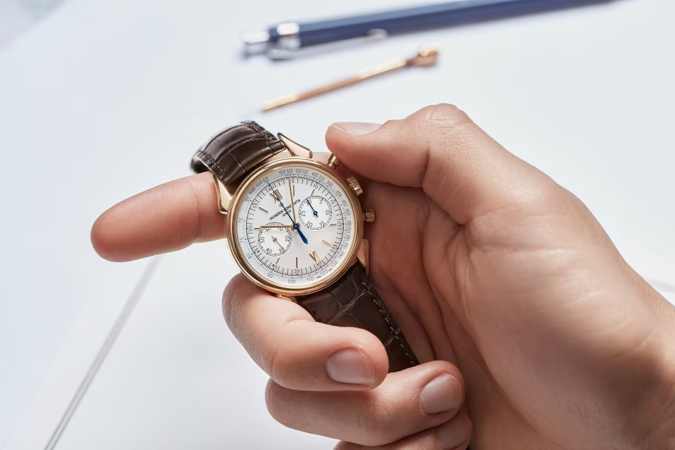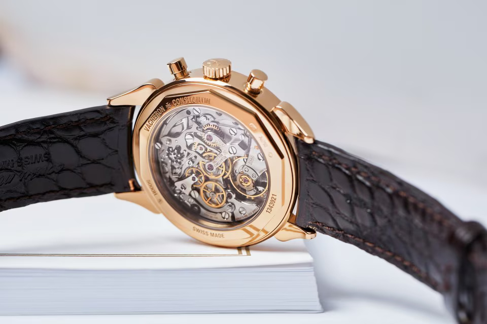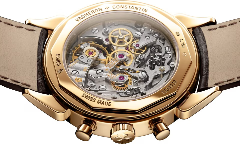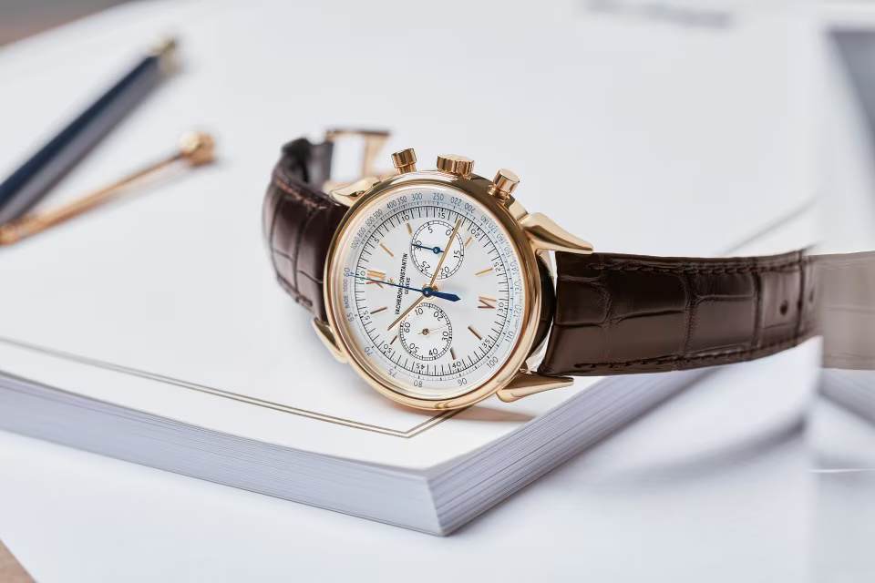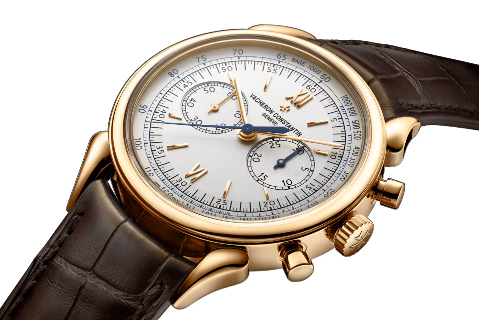 This watch in 18K 4N pink gold pays tribute to the legendary and assertive ?cow horns? that adorned the 1955 manual-winding chronograph, reference 6087, the first water-resistant chronograph manufactured by Vacheron Constantin. Painted in blue, the tachymeter scale makes it possible to determine an average speed thanks to the central hand of the chronograph. This splendid column-wheel chronograph caliber is stamped with the Hallmark of Geneva, a guarantee of excellence and reliability.