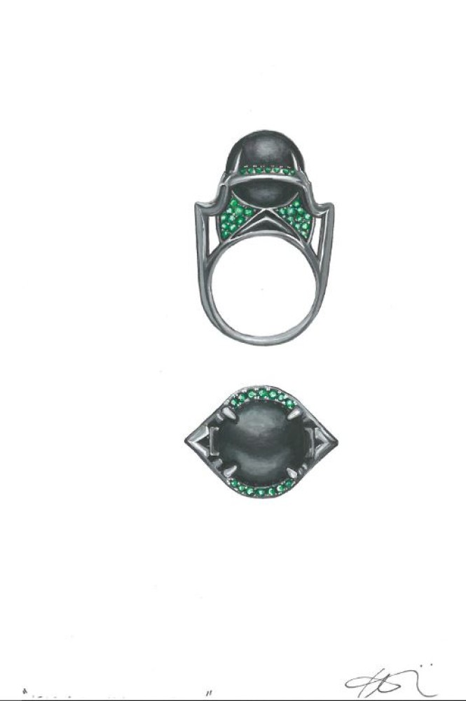 Angie Marei designed this ring after the birth of her son. It is inspired by Isis, the Ancient Egyptian goddess of the moon, fertility, healing and magic. The unique architectural design holds a large black Tahitian pearl as if showcased in a throne. Isis is the essence of femininity and is exalted in her role as the life-giving mother, wife, healer and protector. The regal name Isis also means “woman of the throne.”