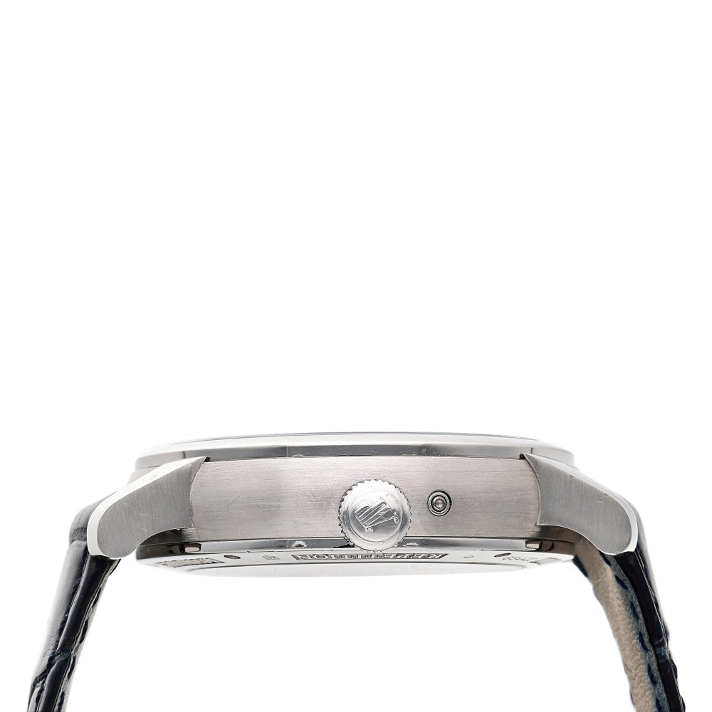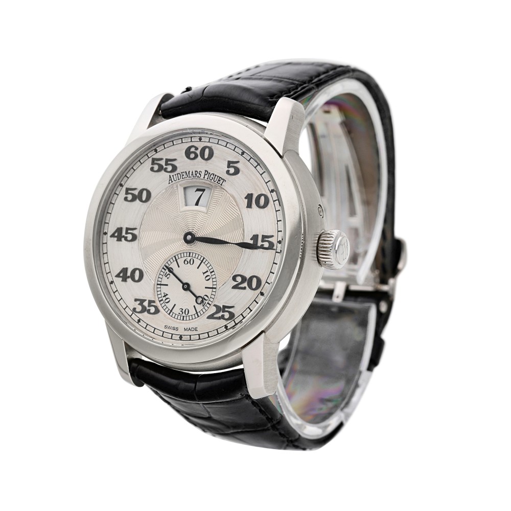 The present Jules Audemars timepiece is crafted from platinum and features jumping hour and minute repeater complications. The silver guilloch? dial has traditional blued hands and Arabic minute numerals with the current hour displayed in a window above the central minute hand. A sapphire display back allows for viewing of the brand’s caliber 2907, an impeccably finished manual movement further affirming the technical prowess of Audemars Piguet’s master watchmakers.