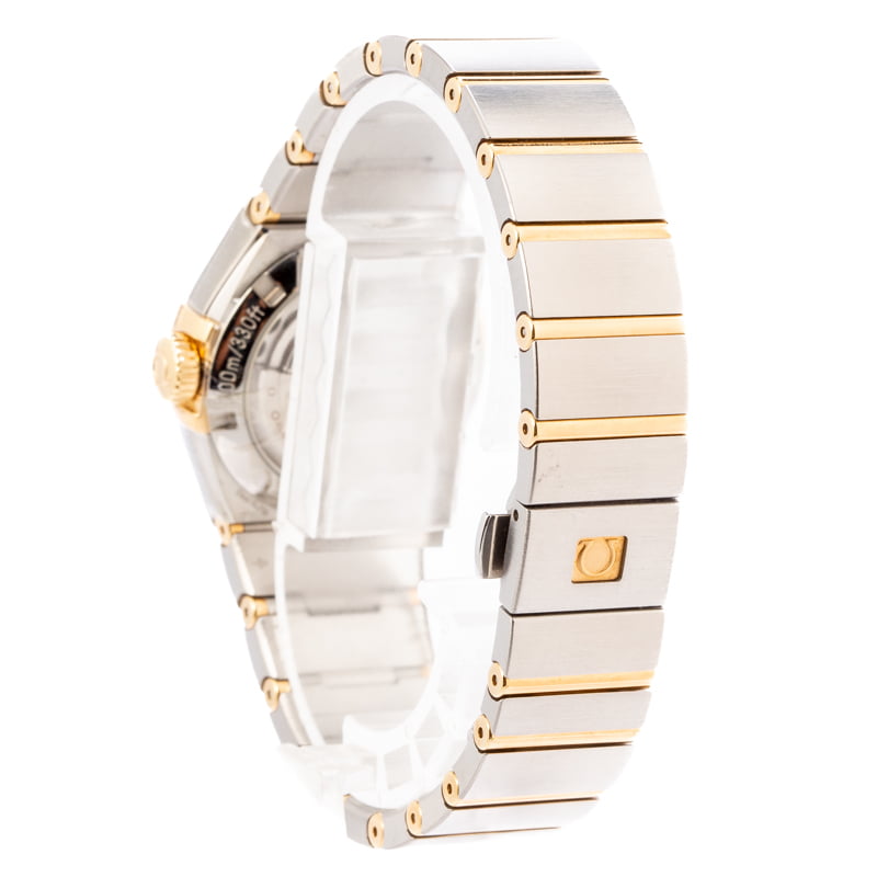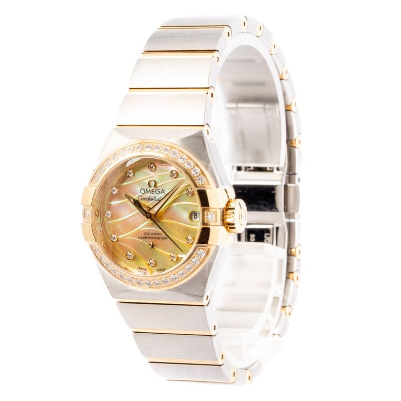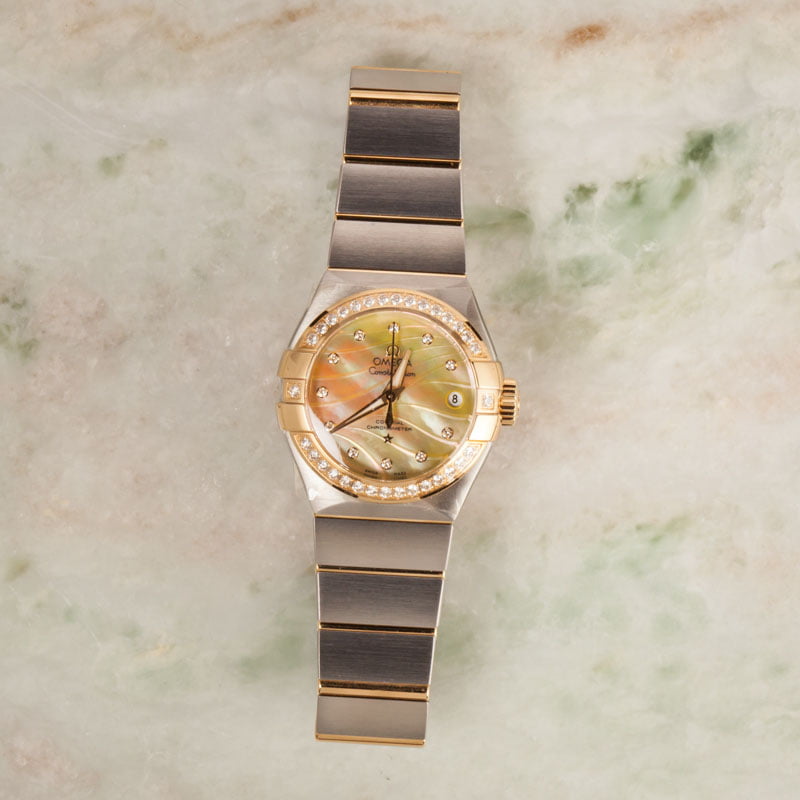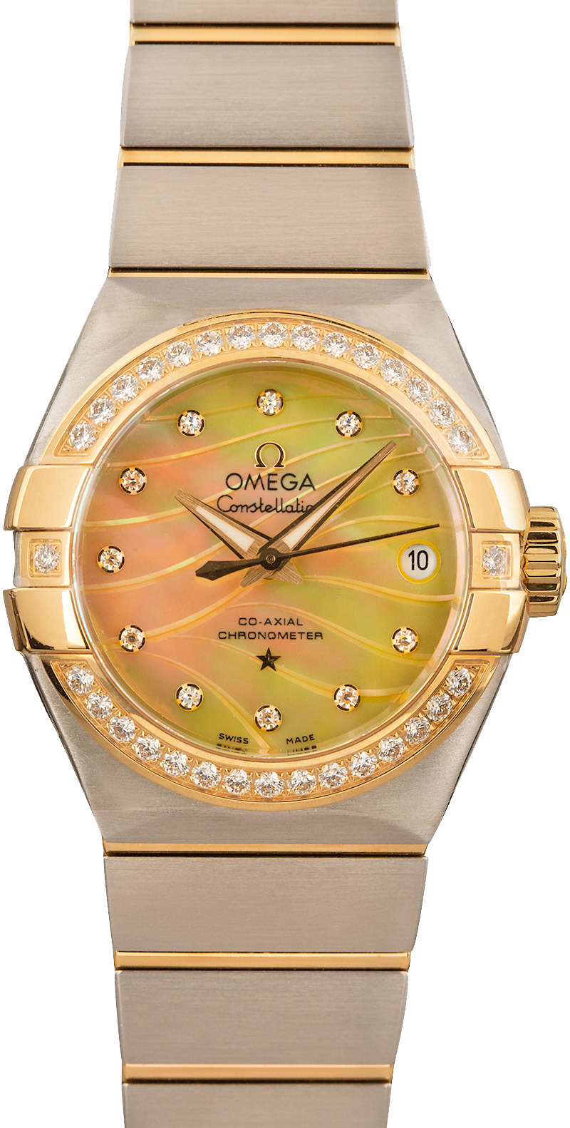 This women’s Omega is dripping in diamonds but is a classy and wearable way. The case is surrounded by the Constellation collection’s signature Griffe bezel and features glittering diamond brilliants. Reference 123.25.27.20.57.002 also features a wavy pattern champagne Mother of Pearl dial with a tiny diamond brilliants set at each hour marker. However, what we love most about this particular Omega is that it features an Omega Co-Axial self-winding caliber 8520 movement. It isn’t common to see such a powerhouse automatic movement tucked inside a small case size. This two-tone Omega Constellation packs a lot of punch in functionality yet is still flattering and elegant.
