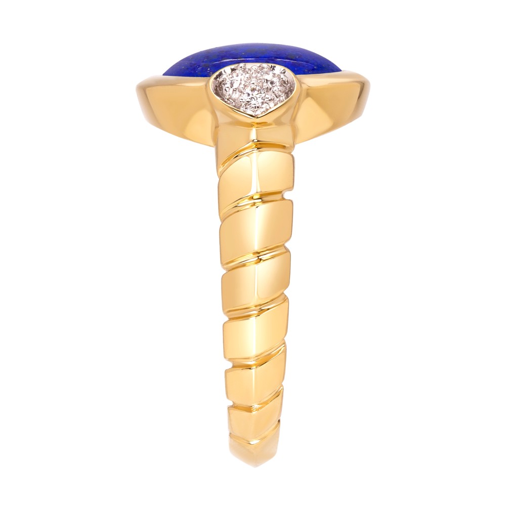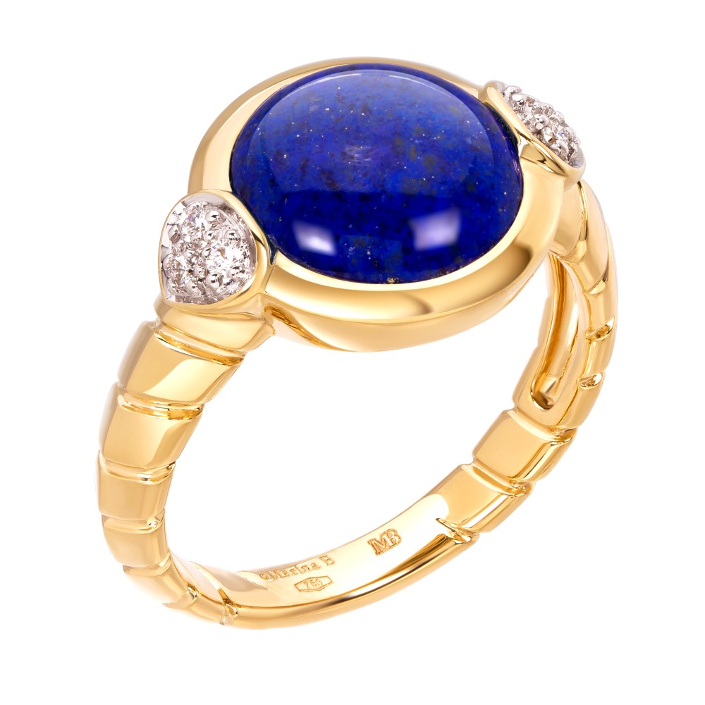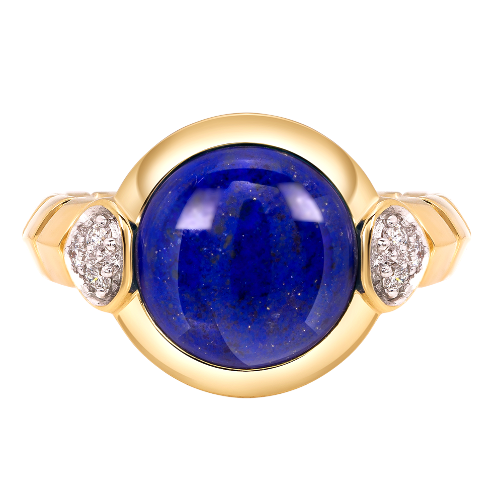 Centering a cabochon lapis lazuli, accented by diamonds.