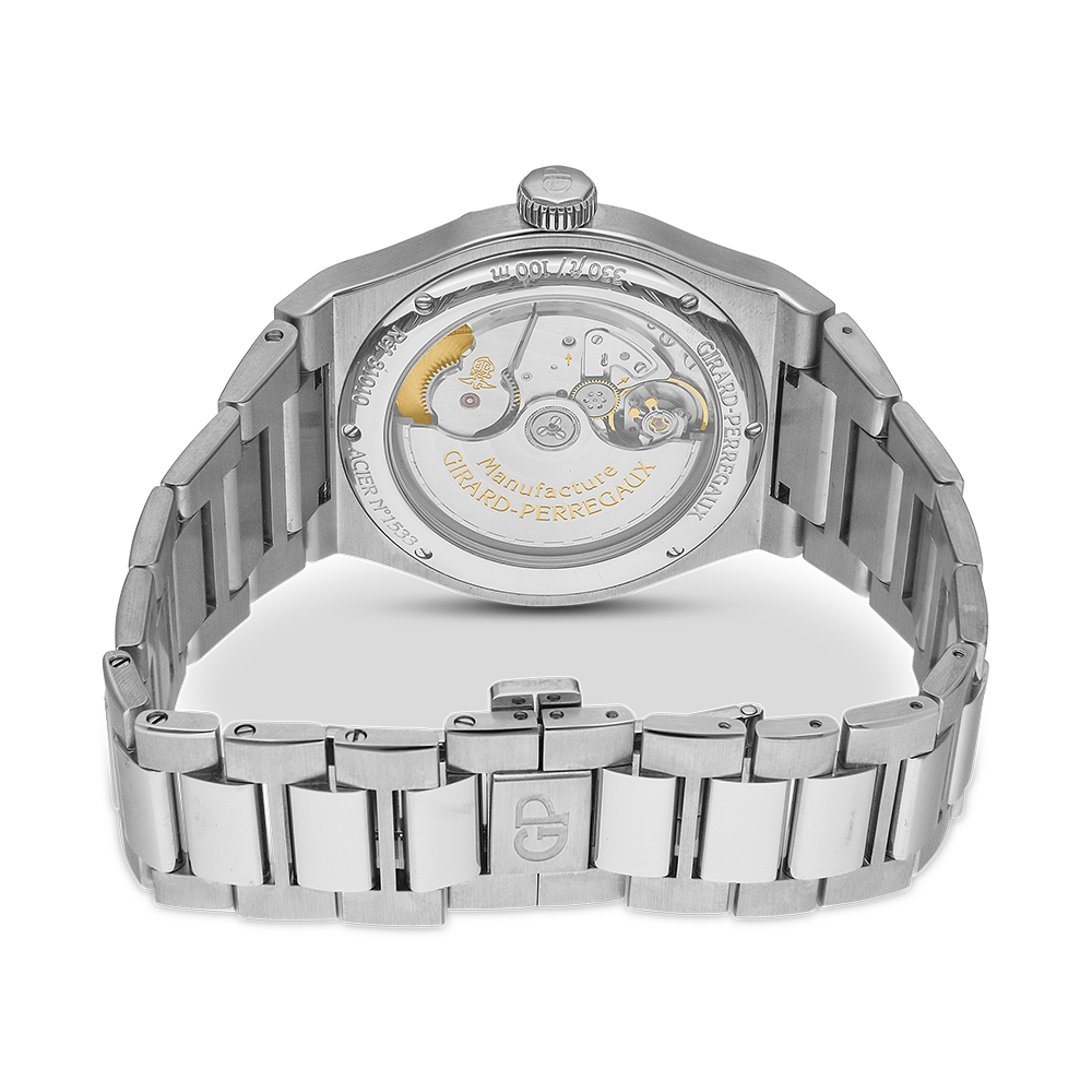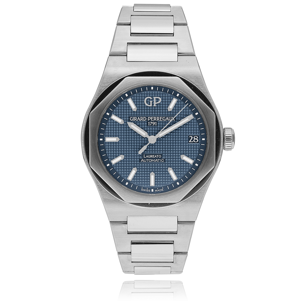 Girard-Perregaux Laureato with a 42 mm stainless steel case and a sapphire glass, water resistant; inside is the automatic calibre , a blue index face indication, the bracelet is a steel metal bracelet; accessory: sales guarantee (original), bucherer box.