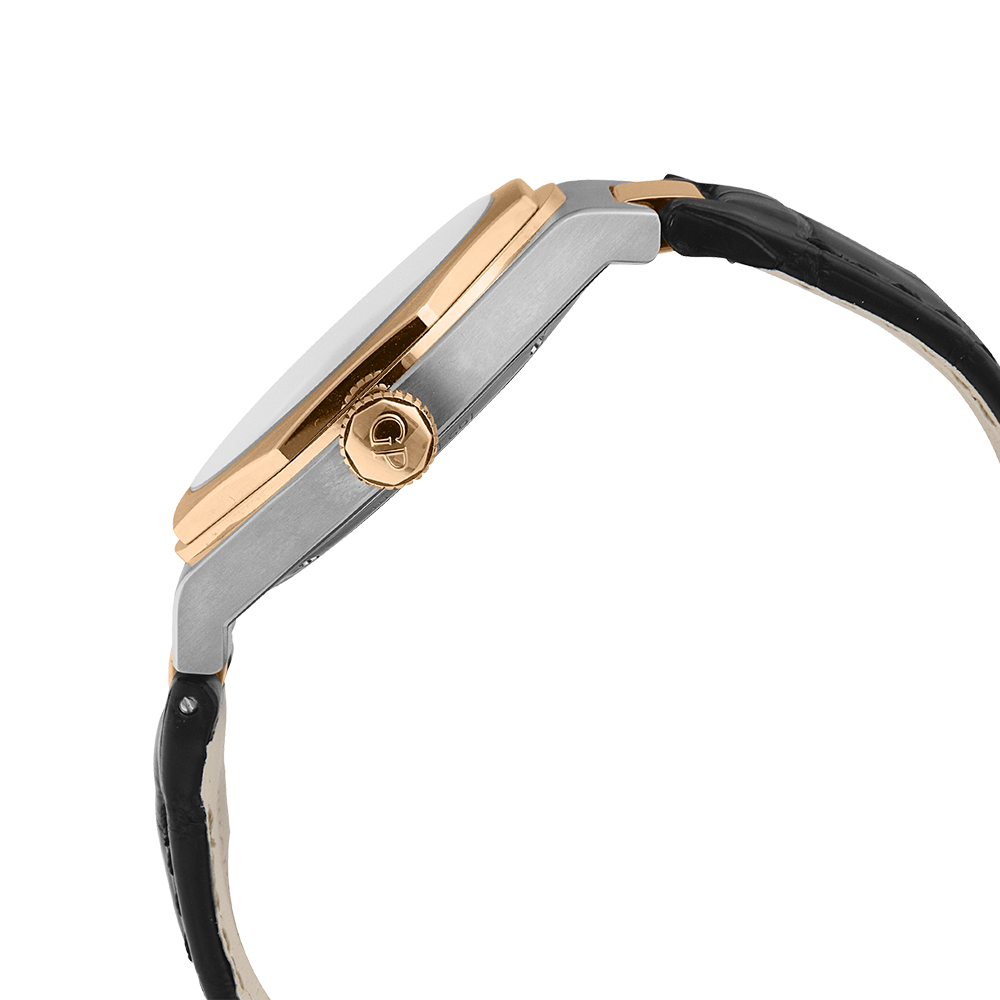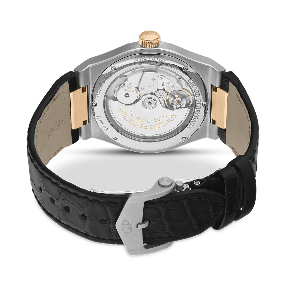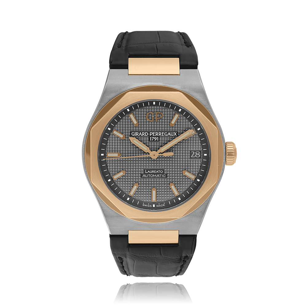 Girard-Perregaux Laureato with a 42 mm bicolour case and a sapphire glass, water resistant; inside is the automatic calibre , a silver index face with date indication, the bracelet is a alligator leather; accessory: sales box (original), sales guarantee (original).
