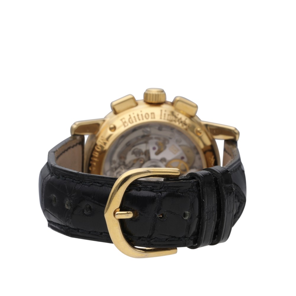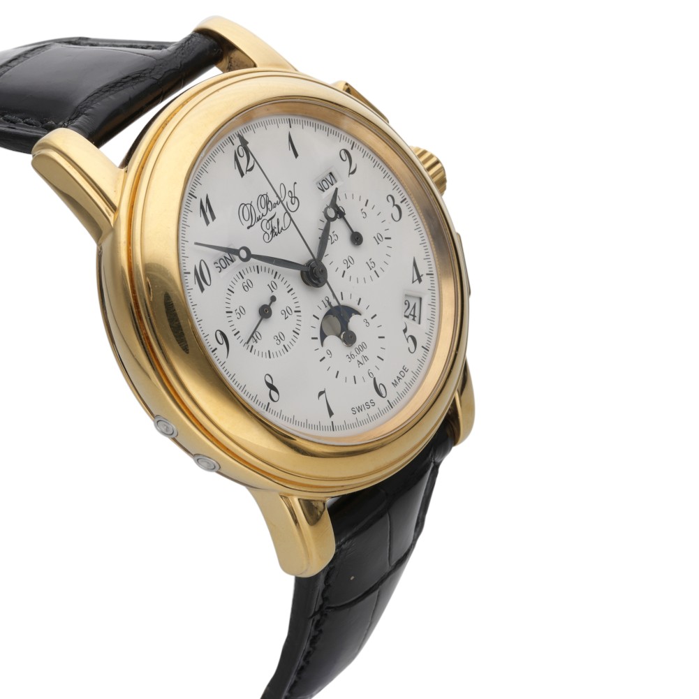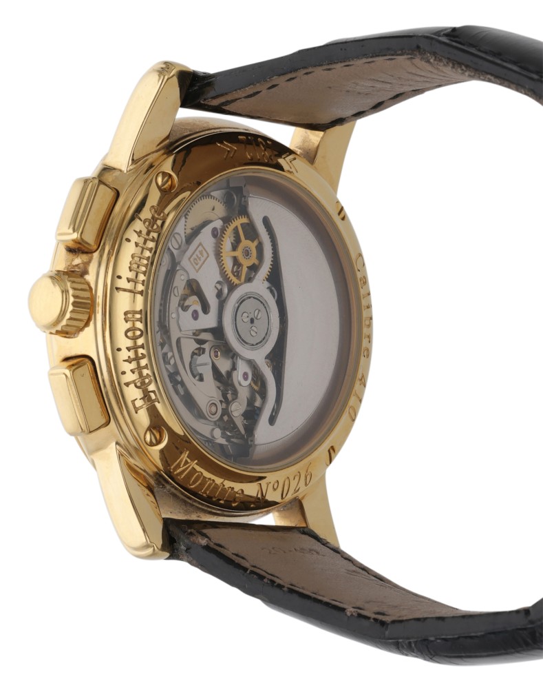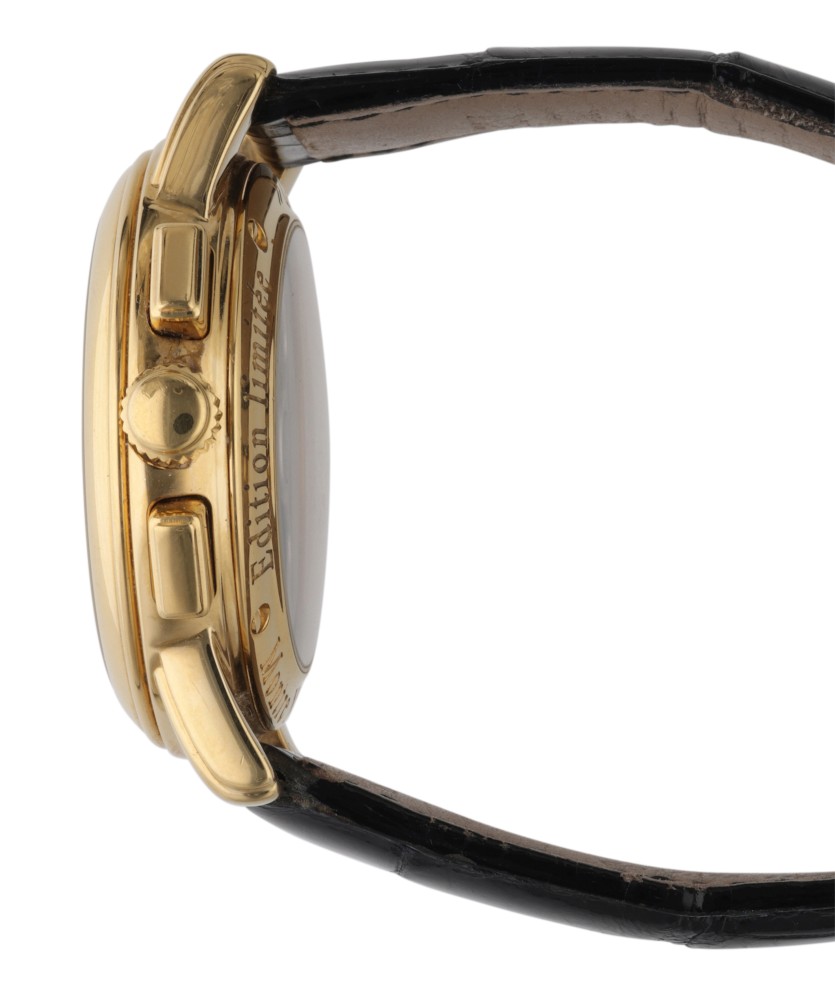 With an over 300-year history, DuBois et Fils began as a textile trading company. In the 1720s, Moise DuBois took leadership and began trading pocket watches by 1743. By 1751, DuBois et Fils began to produce their own watches and sold more than 110,000 pocket watches. Continuing on this incredible success, they transitioned to making wristwatches in 1910. DuBois is the oldest Swiss factory with a wide collection of high-quality timepieces. This is a rare timepiece of the elegant chronograph from the house of DuBois & Fils in a gold case. It features an aperture showing the date between 3 o’clock and 4 o’clock, a window located at 6 o’clock showing the moon phase, and a white dial with a legible Arabic number to tell time. Accompanied by a black crocodile strap.