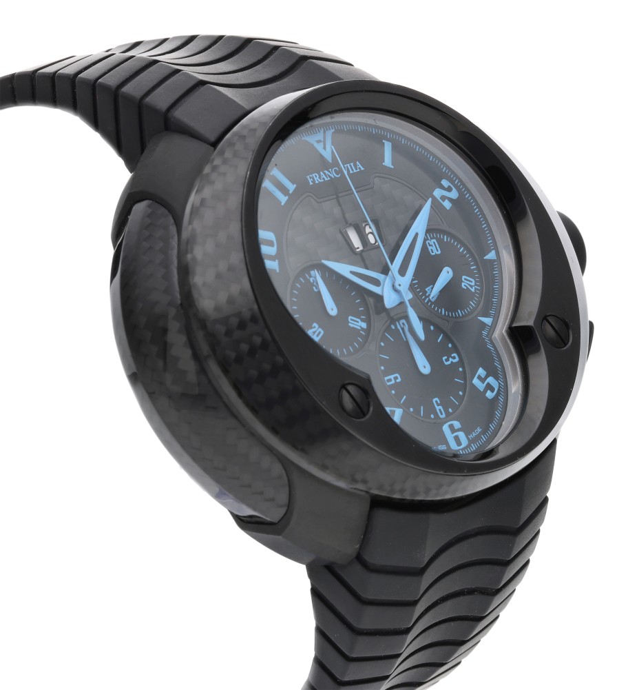 Limited-edition Franc Vila Evos 8 Cobra Stealth “Esprit Unique” in black ceramic and blackened diehard extreme steel with carbon-fiber. Inspired by the resemblance of a cobra head, the reptilian look is further segmented by the rubber strap style.